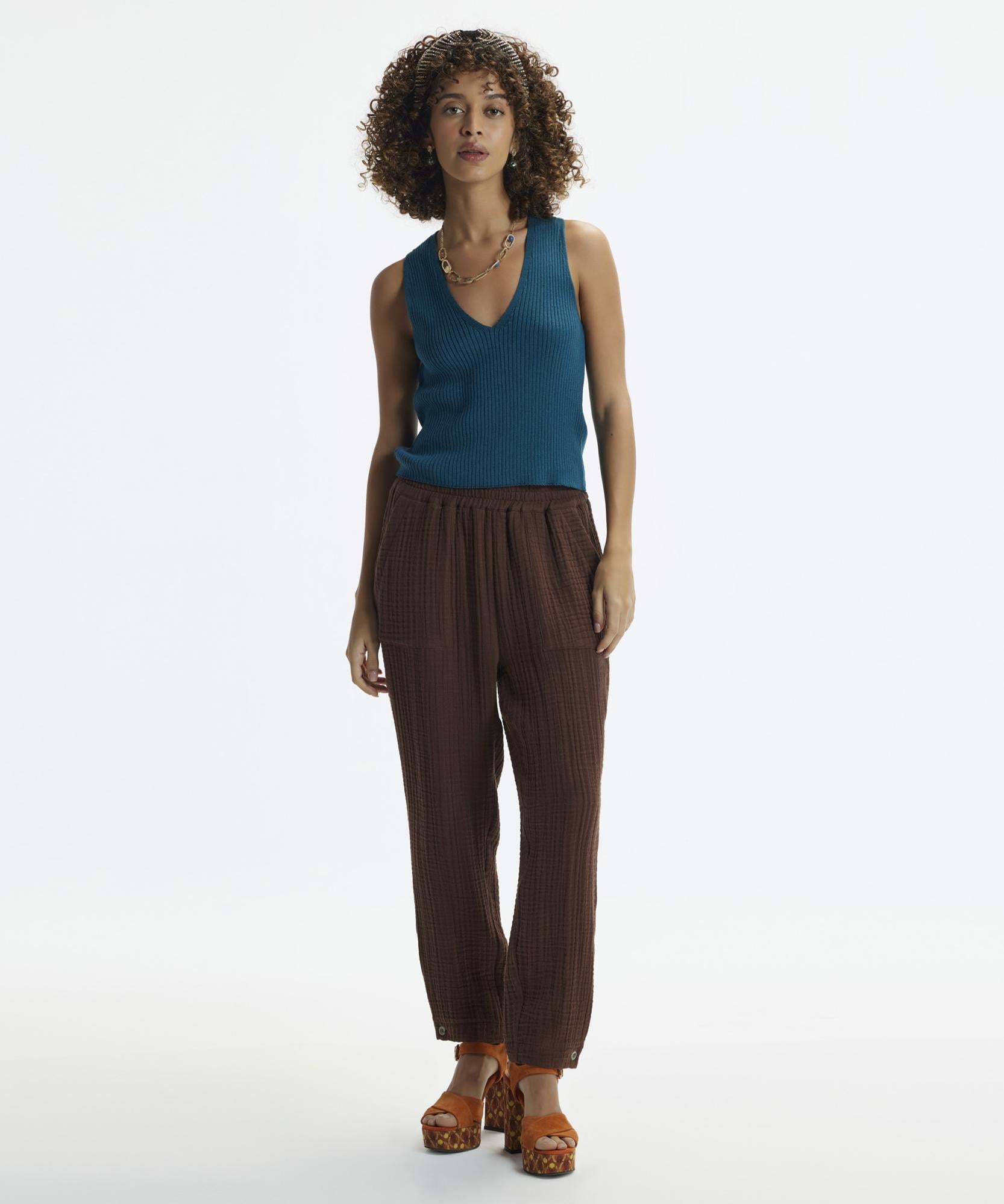 Bu zarif pantolon, zamansız bir tarz sunuyor. Kumaşın dokusu ve kalitesi, şık bir görünüm sağlarken, cepleri pratik bir dokunuş ekler. Ofis şıklığı için ideal olan bu parça, gömlek veya bluzlarla mükemmel uyum sağlar.