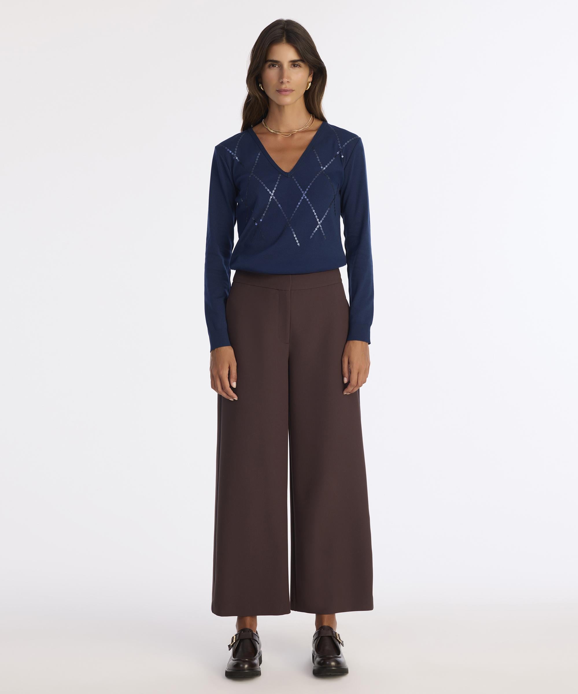Geniş paça kesimiyle rahat bir duruş sunan bu pantolon, sade ama şık görünümüyle dikkat çekiyor. Yüksek bel formu, bel bölgesini toparlarken modern bir siluet kazandırıyor. Ofis stilinden günlük kombinlere kadar farklı alanlarda kolayca uyum sağlayabiliyor. Kış aylarında fitilli kazaklar ve kalın topuklu botlarla zarif bir kombin oluşturabilirsiniz.