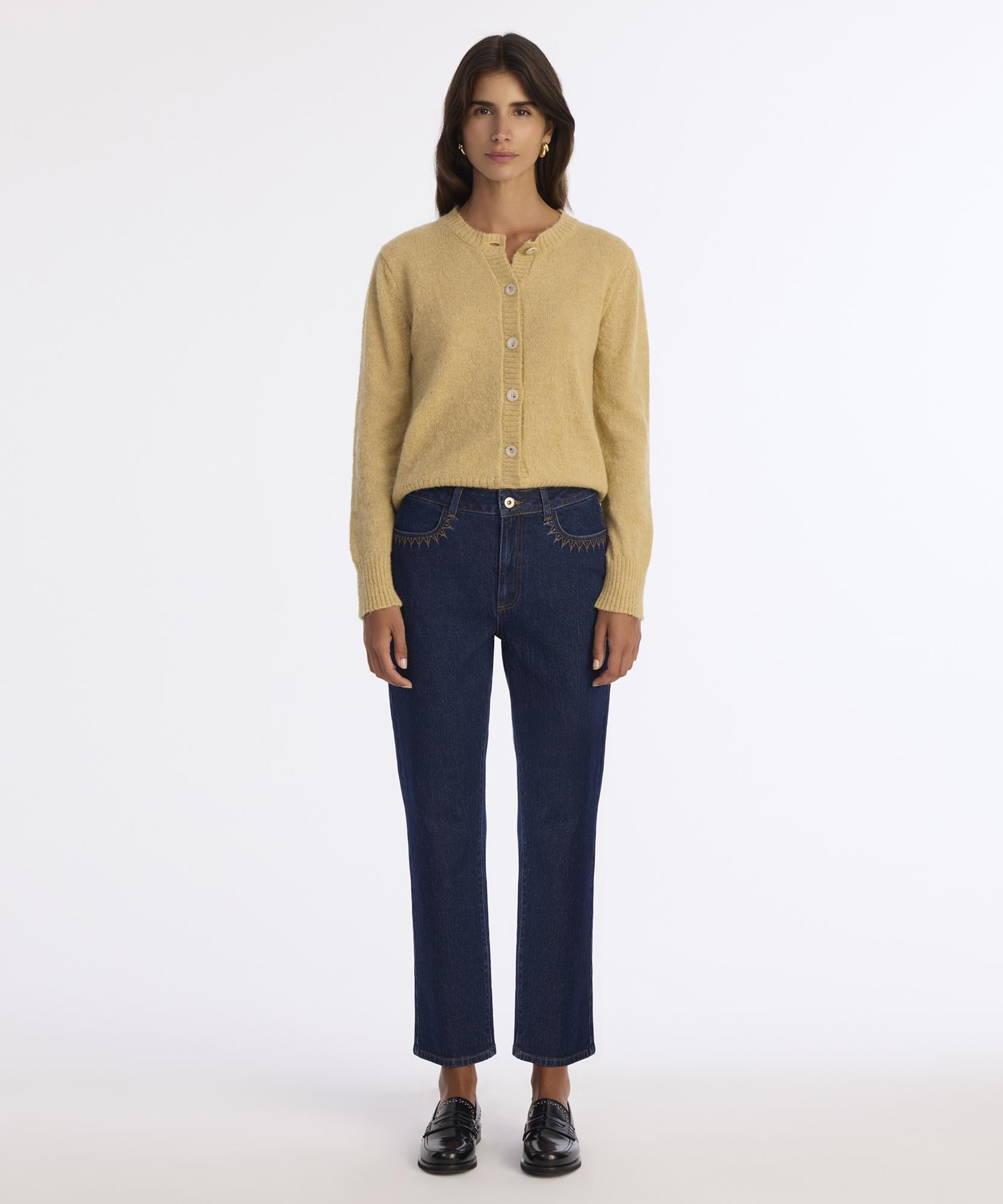 Cep kenarlarında yer alan dekoratif zikzak dikiş detaylarıyla öne çıkan bu denim pantolon, klasik formuna özgün bir hava katıyor. Hafif İspanyol paça kesimiyle feminen bir siluet sunarken rahat kalıbıyla konforlu bir kullanım sağlıyor. Kış aylarında salaş bir kazak ve kısa mont ile kombinlenerek günlük stilinizi yükseltebilirsiniz. Sade detaylarla fark yaratmak isteyenler için şık bir tercihtir.