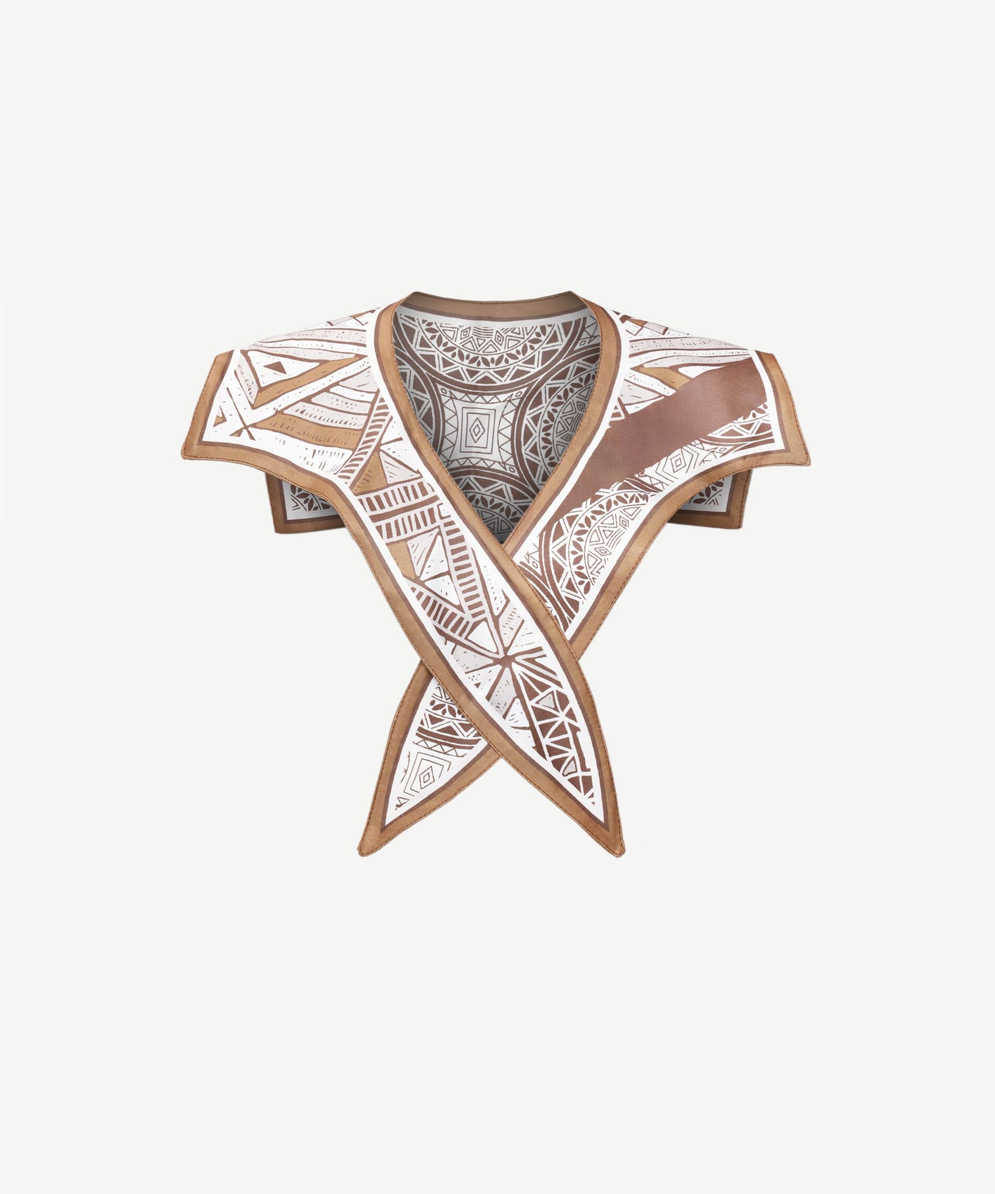Etnik esintili desenleriyle dikkat çeken bu yaka formundaki fular, sıcak toprak tonları ve geometrik motifleriyle güçlü bir stil ifadesi sunuyor. Minimal parçalarla kombinlendiğinde modern bir kontrast yaratırken, doğal kumaş dokusu sayesinde konforlu bir kullanım sağlıyor. Zamansız bir duruşla öne çıkan bu tasarım, günlük stilinize özgünlük katmak isteyenler için ideal.