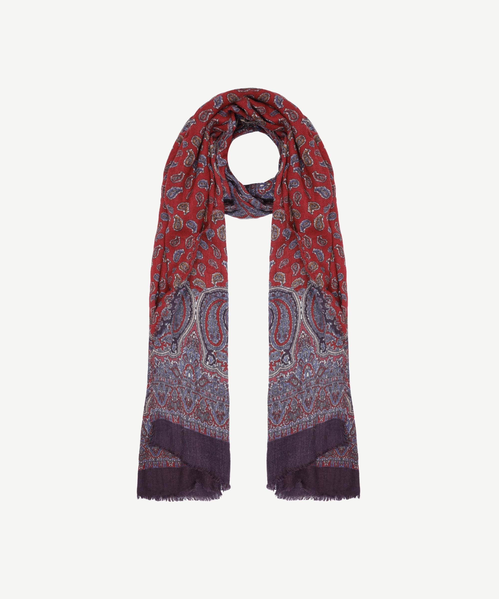 Kırmızı ve mor tonlarının zengin birlikteliğiyle öne çıkan bu etnik desenli şal, klasik stilin modern bir yorumu niteliğinde.Paisley motifleriyle bezeli yüzeyi, günlük kombinlere zarif ve karakterli bir dokunuş katıyor.