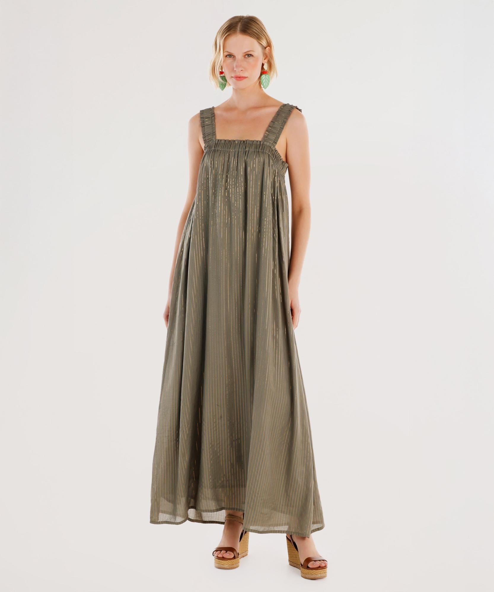 Fırfırlı askıları ve ince çizgili dokusuyla romantik bir stil sunan bu maxi elbise, rahat kesimi sayesinde hareket özgürlüğü sağlar. Günlük kullanımda spor ayakkabılarla, özel günlerde şık sandaletlerle kombinlenebilir.