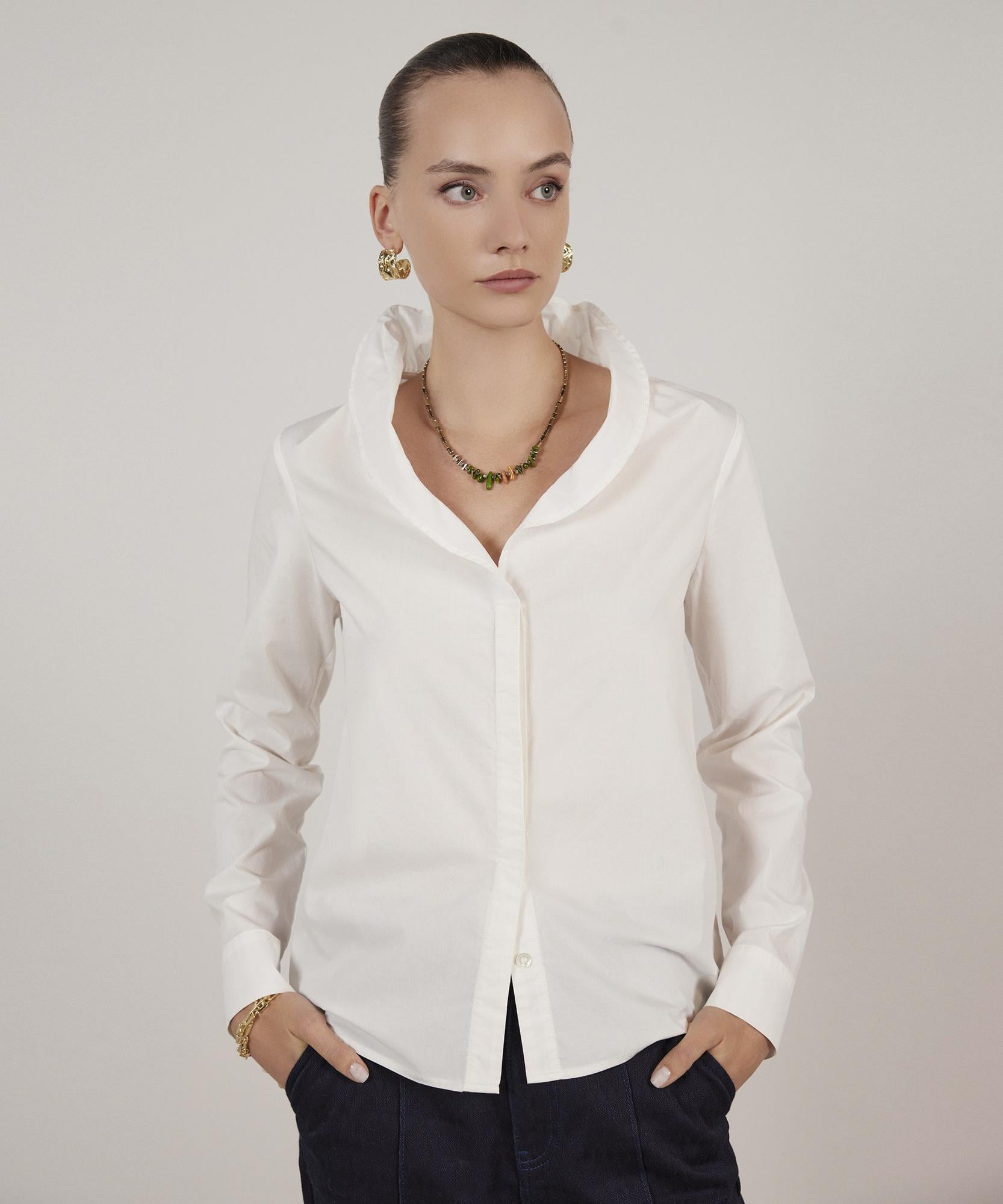 Pamuk gömleğin ikonik stili yakasının özgün tasarımında öne çıkıyor. Gömleği pirinç ve inci detaylı aksesuarlarla eşleştirerek klasik tarzınızı yansıtabilirsiniz.