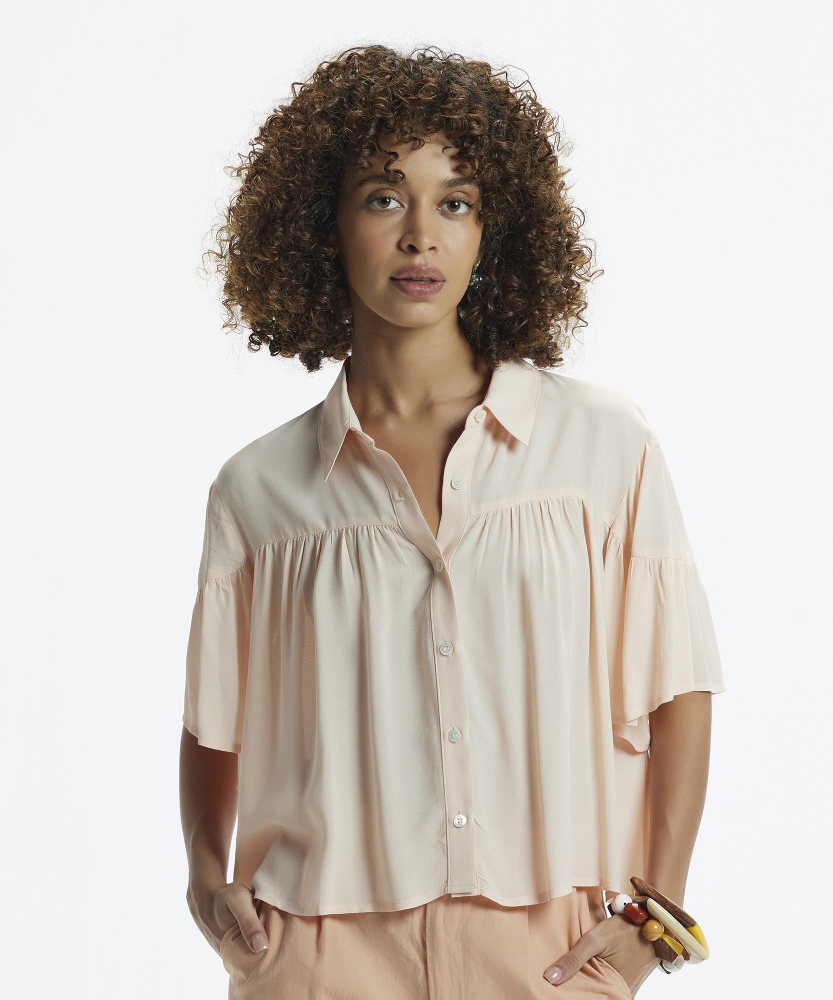 Bu bluzun feminen tasarımı ve rahat kesimi, her türlü ortam için uygun bir seçenek sunuyor. Geniş kesimi ve şık tasarımı, herhangi bir pantolon veya etekle kolayca uyum sağlarken şıklığın yanı sıra sizi gün boyu rahat ettirir.