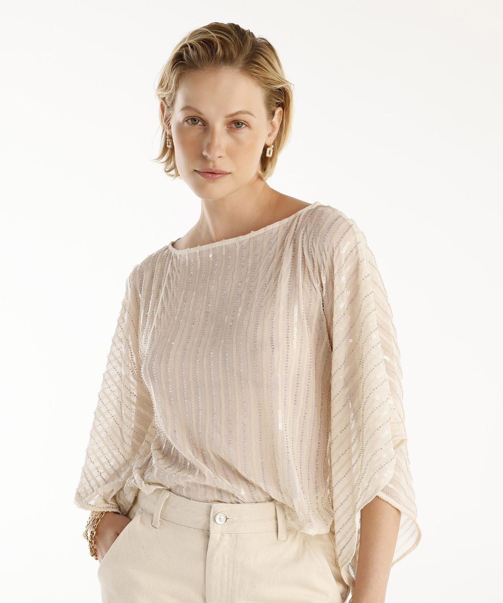 Geniş, dökümlü kolları ve ışıltılı detaylarıyla bu bluz, özel günler için mükemmel bir seçimdir. Bej rengin üzerinde yer alan ince şeritler, zarafeti ve modernliği bir arada sunar. Hem şıklığı hem de rahatlığı bir arada arayanlar için idealdir.