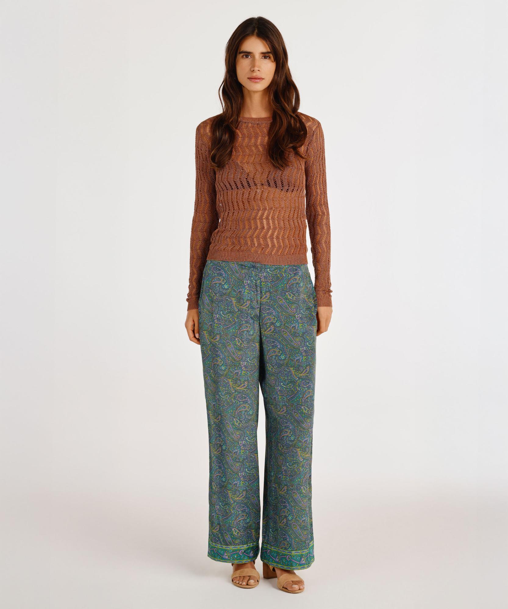 Paisley desenleriyle dikkat çeken bu pantolon, bohem stilin enerjisini yansıtır. Akıcı kumaşı ve rahat kesimi ile konforlu bir kullanım sunarken, sade üstlerle kombinlenerek denge sağlanabilir.