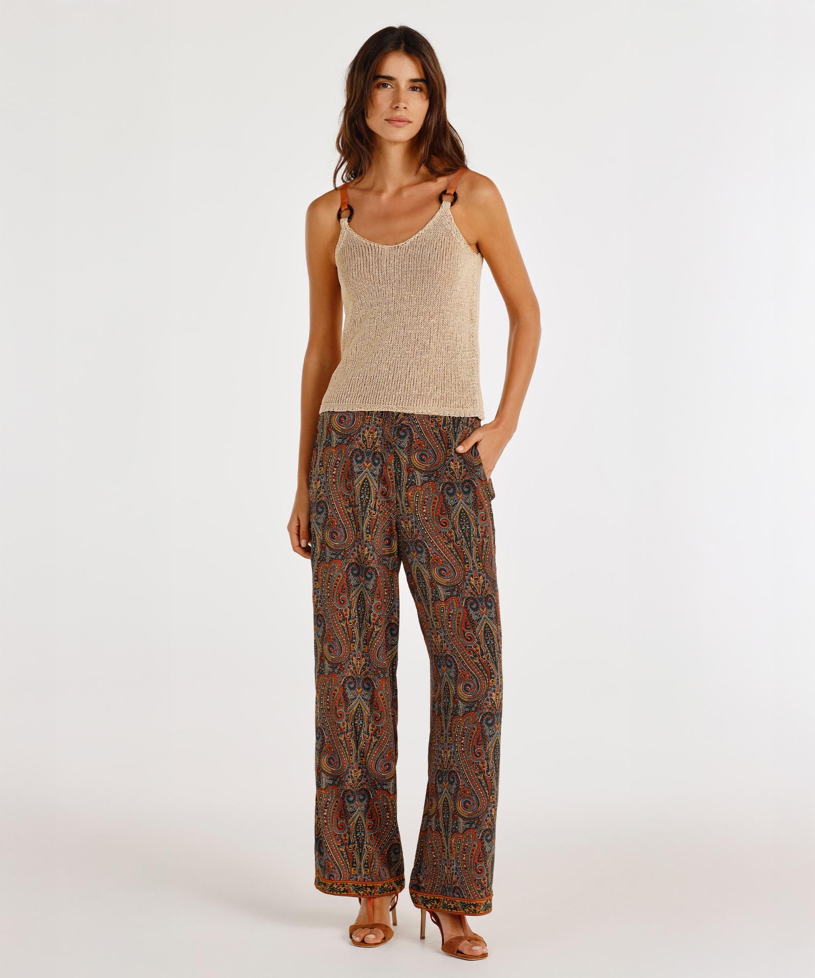 Paisley desenleriyle dikkat çeken bu pantolon, bohem stilin enerjisini yansıtır. Akıcı kumaşı ve rahat kesimi ile konforlu bir kullanım sunarken, sade üstlerle kombinlenerek denge sağlanabilir.