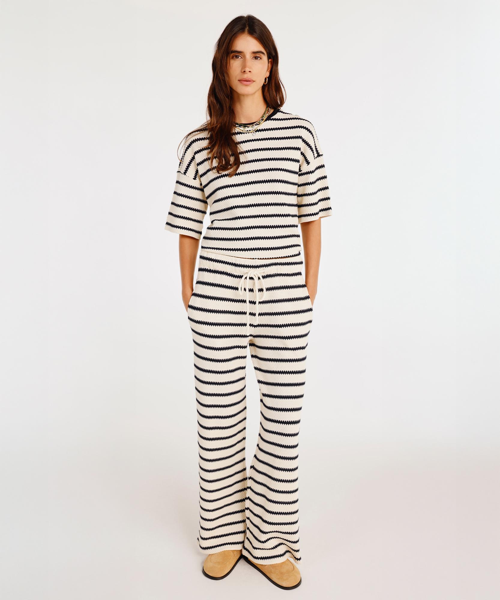 Geniş paça ve bağcık detaylarıyla rahat bir kesime sahip triko pantolon, konforlu ve şık bir stil sunar. Hafif ve esnek kumaşı sayesinde gün boyu hareket özgürlüğü sağlarken, casual ve modern kombinlere uyum sağlar. Hem günlük hem de tatil kombinlerinde tercih edilebilir.