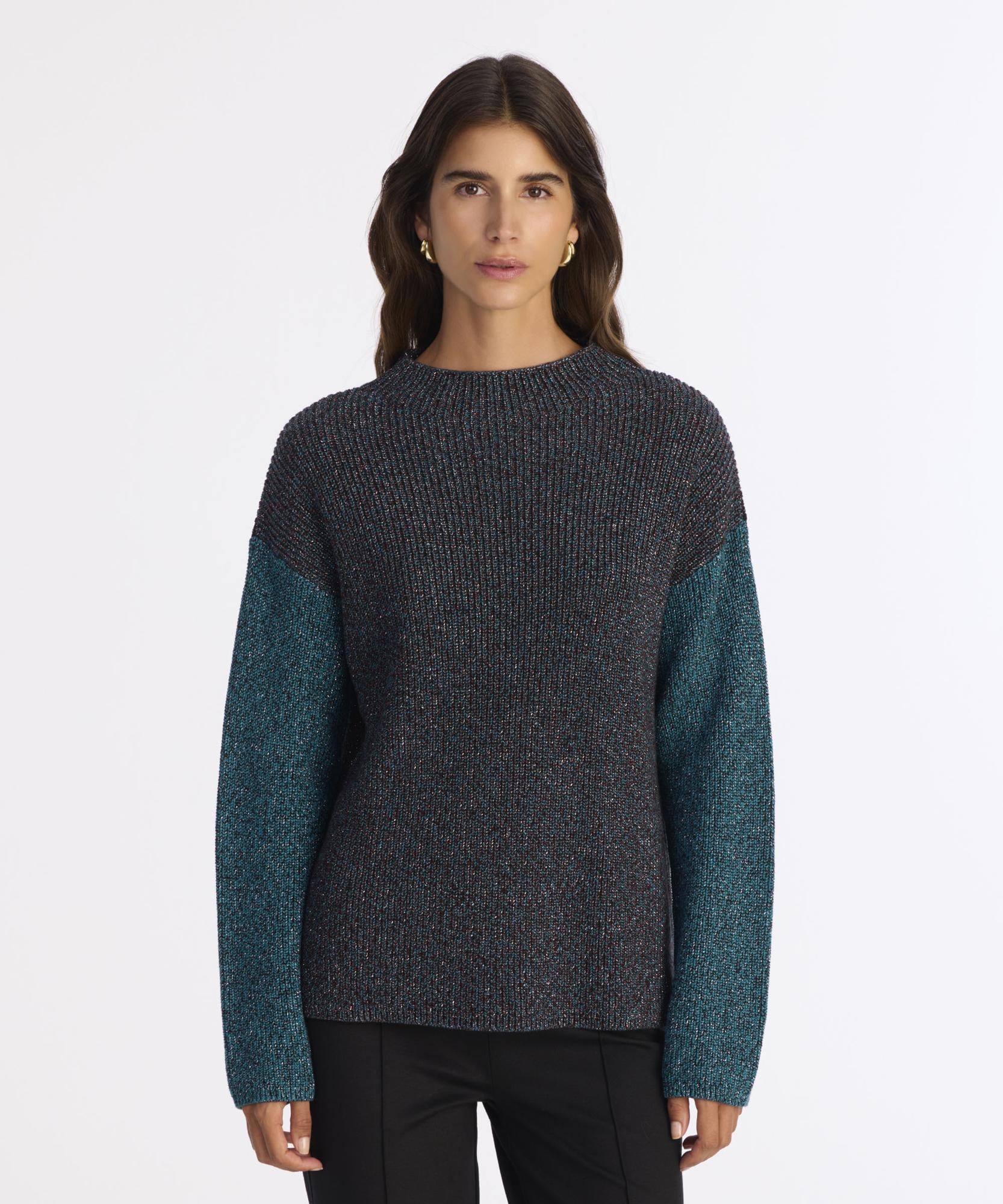 Simli iplik detaylarıyla ışıldayan bu kazak, renk bloklarıyla hareket kazanan dinamik bir tasarıma sahip. Yan yırtmaç detayı ve arka kısmın hafif uzun formu modern ve rahat bir siluet sunuyor. Kış aylarında dar kesim pantolonlar ve kalın tabanlı botlarla kombinleyerek enerjik bir stil elde edebilirsiniz. Gündelik şıklığınızı yansıtırken aynı zamanda konforu da ön planda tutmak isteyenler için harika bir tercihtir.