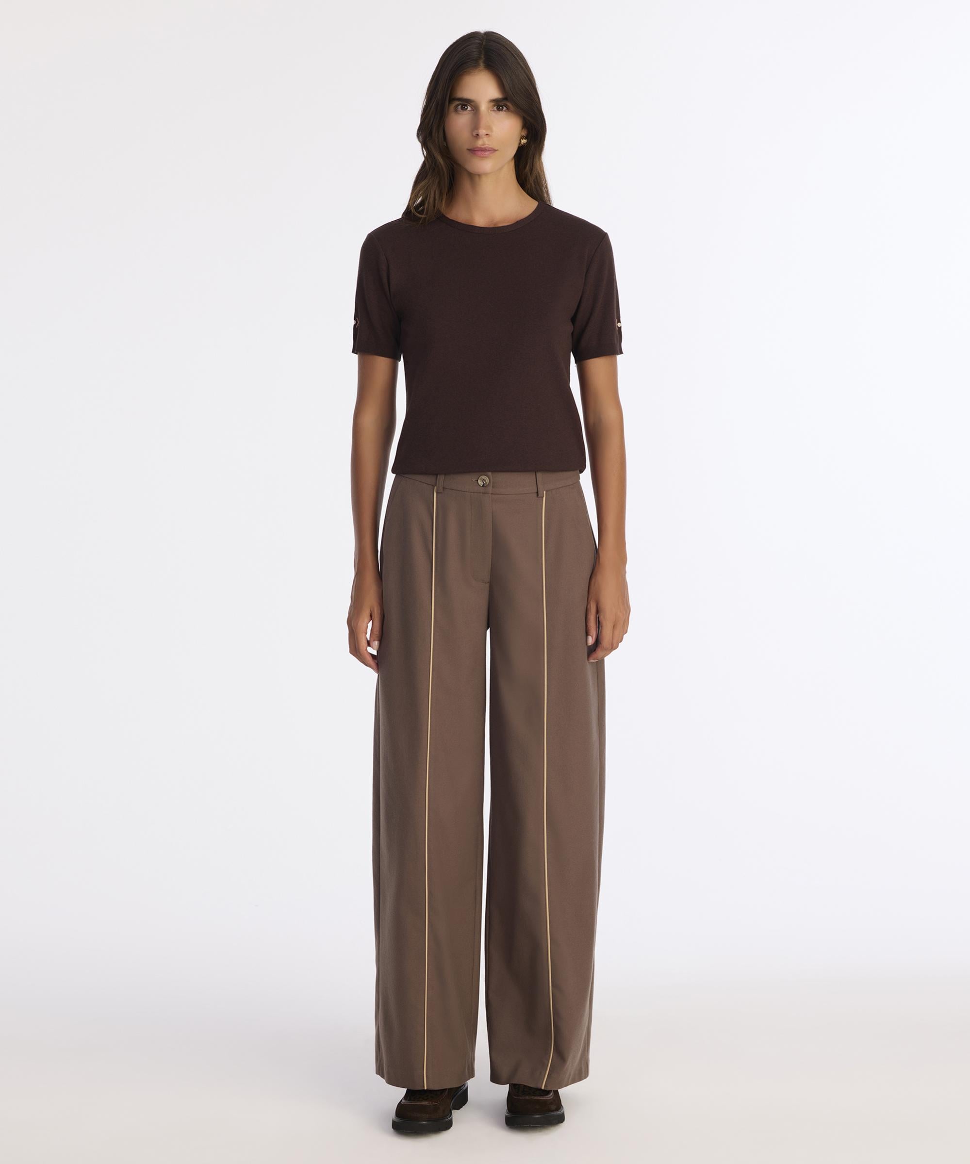 Dik duruş sağlayan fitilli dikiş detaylarıyla tasarlanan bu pantolon, sade ama iddialı bir görünüm sunuyor. Yüksek belli kesimi ve dökümlü yapısı, rahatlıkla şıklığı bir araya getiriyor. Kış aylarında oversize bir blazer ceket ve kalın tabanlı botlarla kombinleyerek modern ve güçlü bir stil elde edebilirsiniz. Günlük ofis stilinize zarif bir dokunuş katmak isteyenler için ideal bir tercih olur.