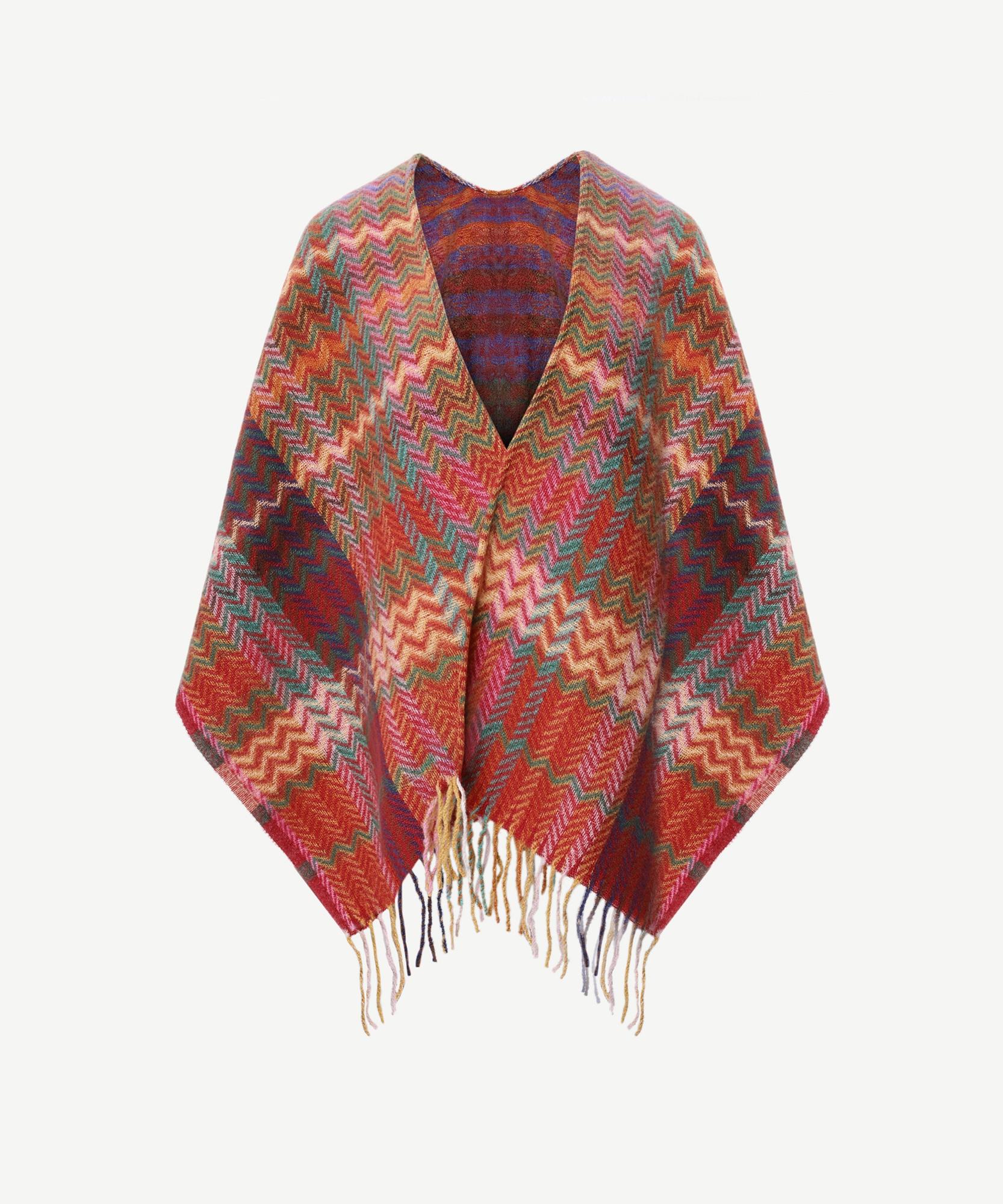 Sıcak kırmızı ve pembe tonlarının enerjisini taşıyan bu panço şal, zikzak desenleriyle dinamik bir görünüm sunuyor. Renkli ve dikkat çekici tasarımı sayesinde sade kombinleri anında canlandırırken, yumuşak dokusu da konforlu bir kullanım sağlıyor. Püskül detaylarıyla hareket kazanan bu parça, soğuk havalarda stilinizi tamamlamanın en renkli yolu.