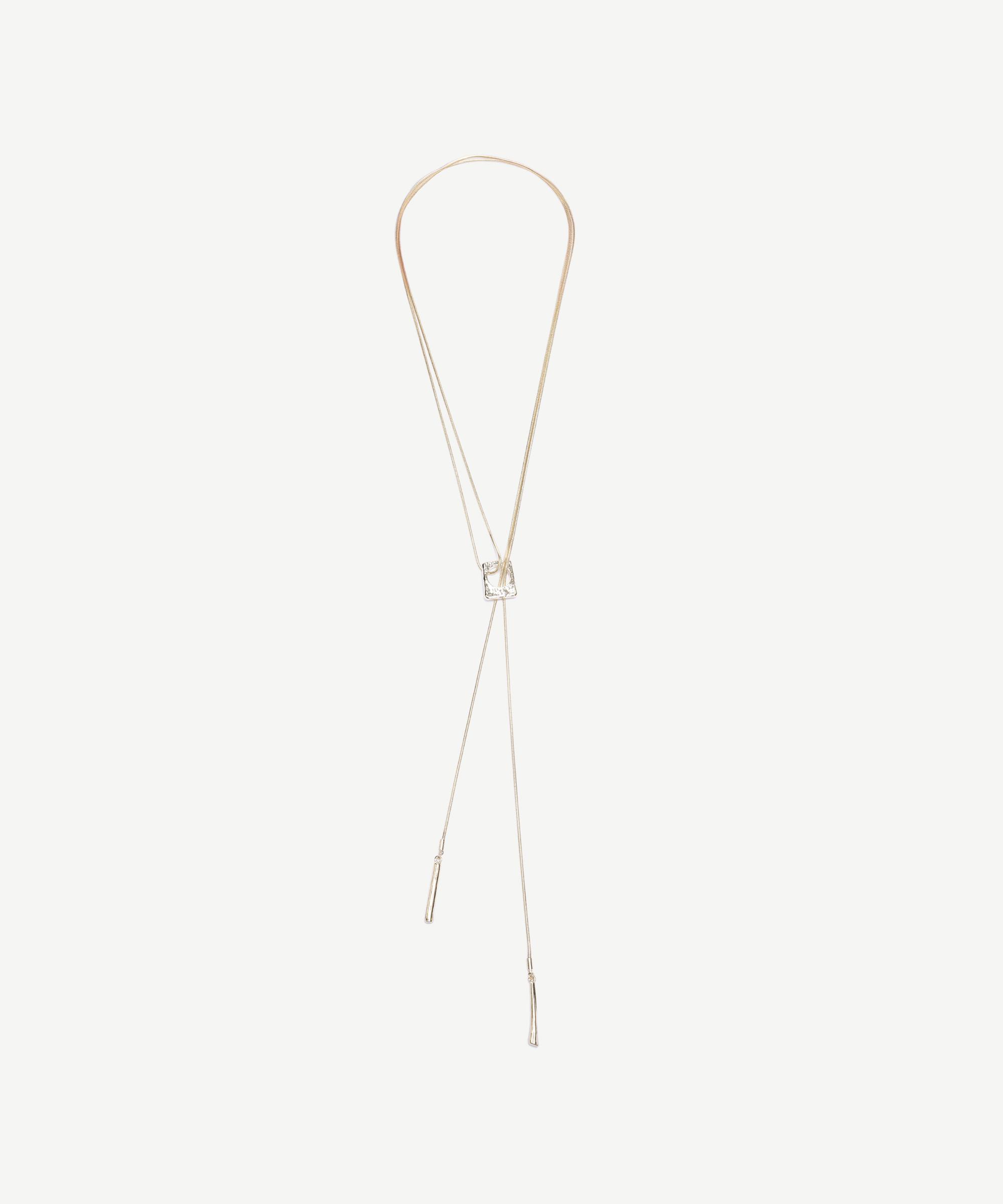 İnce ve uzun formdaki bu kolye, ortasında yer alan kare detayla sadelikten ödün vermeyen modern bir görünüm sunuyor. Özellikle V yaka üstlerle kombinlendiğinde zarif bir tamamlayıcı olarak dikkat çekiyor.