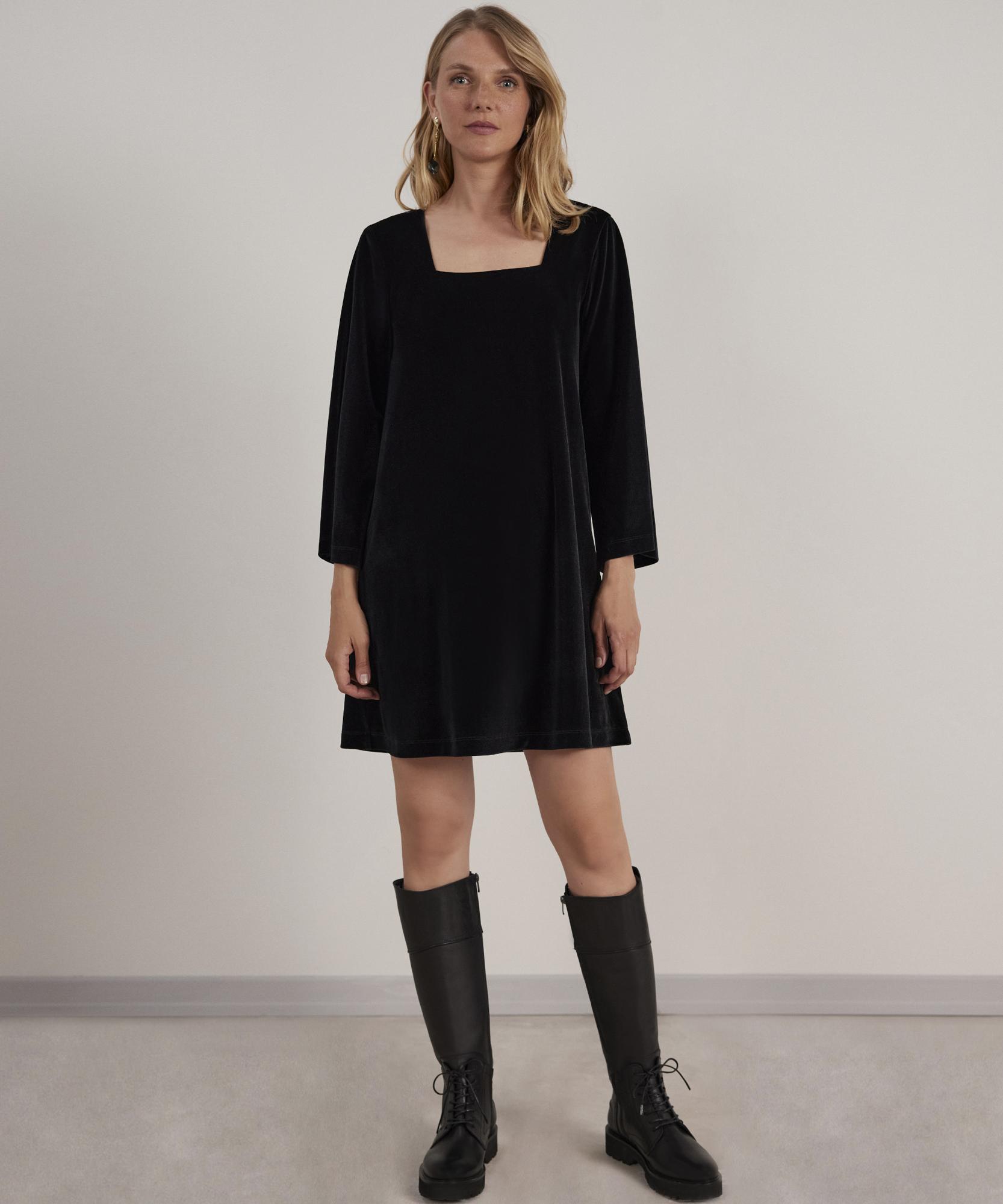 Kare kesim yakaya sahip tek parça elbise etek kısmına doğru hareketlenen formu ile dikkat çekiyor. Özel davetlerde yüksek topuklu ayakkabı ve sallantılı küpelerle eşleştirerek enerjik tarzınızı yansıtın.