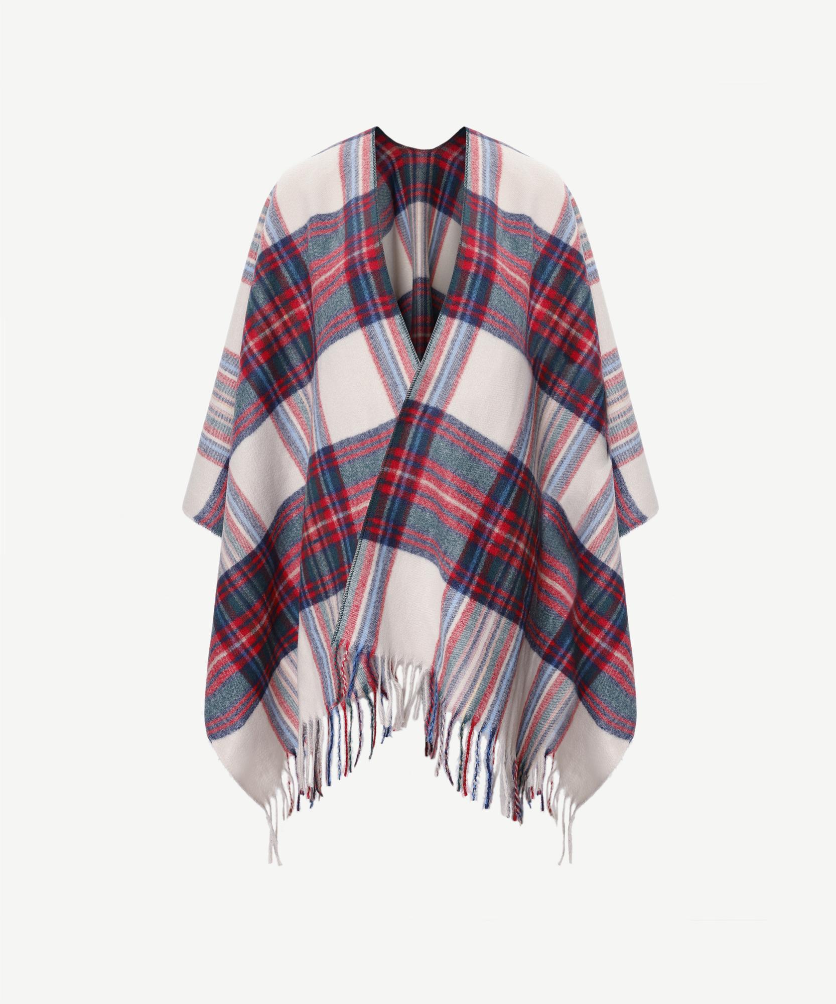 Kırmızı, lacivert ve beyaz tonlarının enerjik uyumuyla tasarlanan bu ekose desenli panço şal, klasik desenlere modern bir yorum katıyor. Yumuşak dokusu ve püskül detaylarıyla sıcaklık ve hareket kazandıran bu parça, hem günlük hem hafta sonu görünümlerine dinamik bir hava katmak için ideal. Rahat kesimiyle konforu da stil kadar ön planda tutar.
