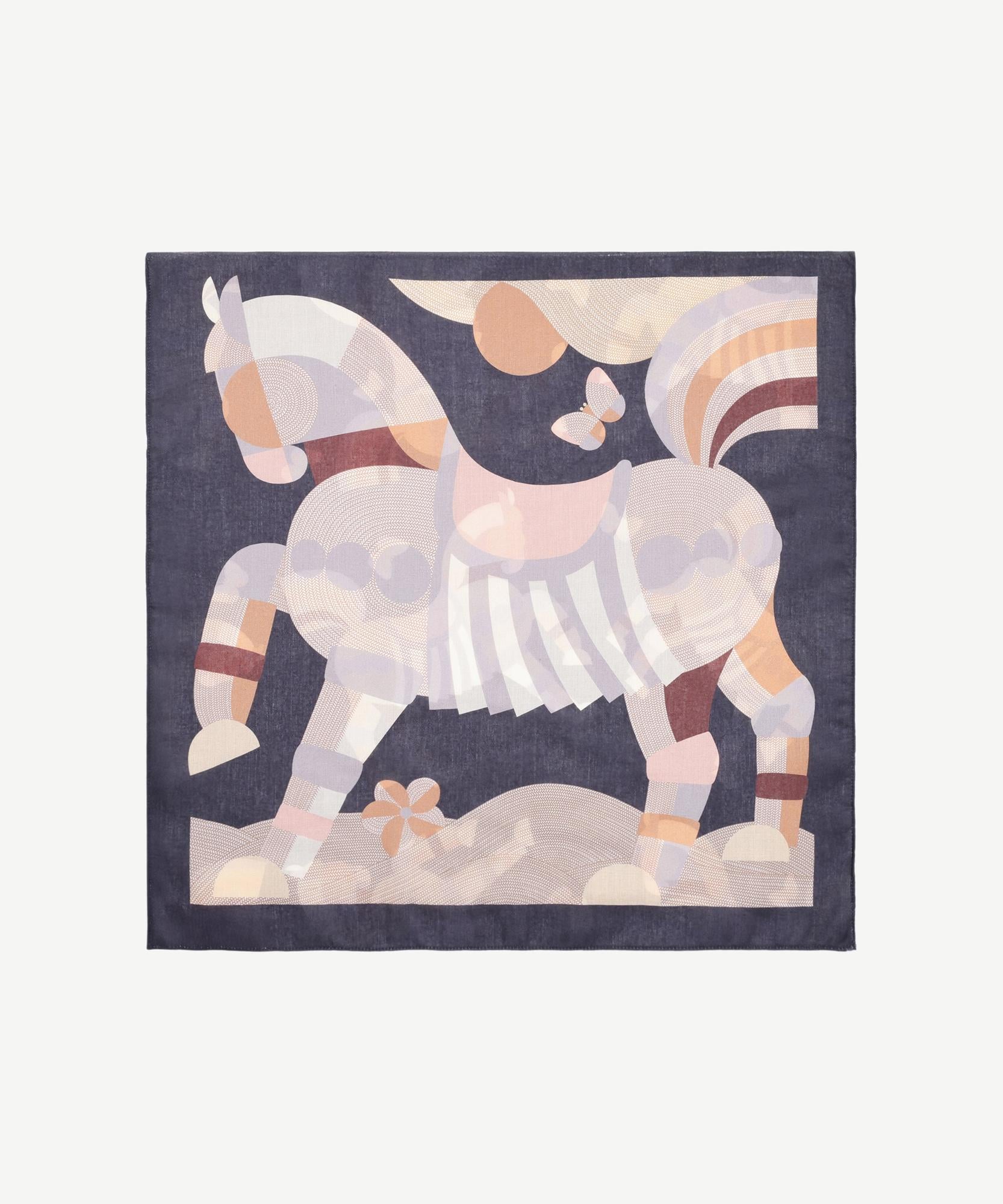 Sanatsal dokunuşlarla tasarlanan bu kare eşarp, pastel tonlarda betimlenen at figürüyle dikkat çekiyor.Boyuna, çantaya ya da saça bağlanarak farklı şekillerde kullanılabilen bu eşarp; stiline yaratıcı ve özgün bir ifade kazandırmak isteyenler için ideal bir parça.