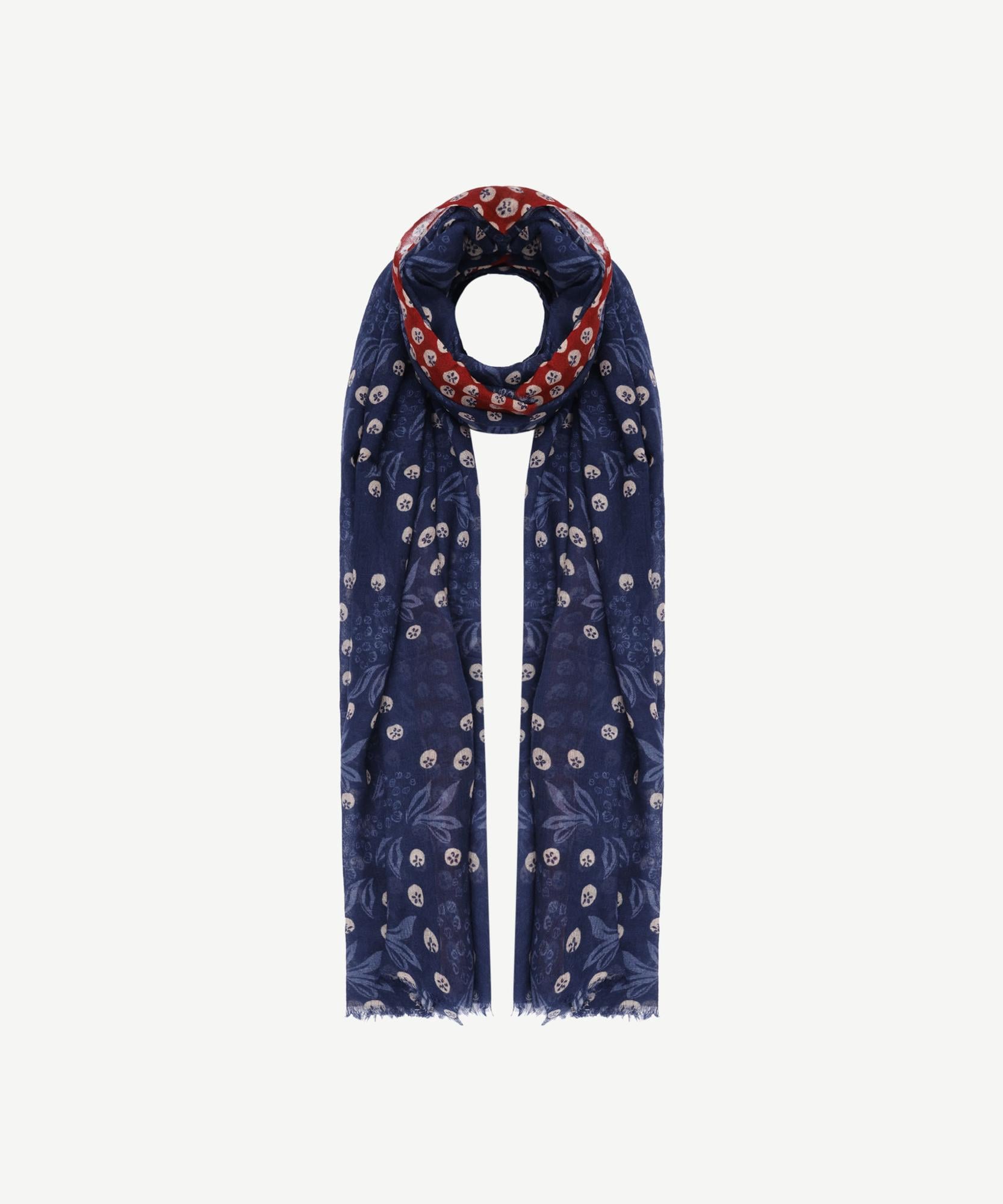 Canlı kırmızı detayıyla hareket kazanan bu lacivert şal, botanik desenlerin eşlik ettiği zarif yapısıyla öne çıkıyor. Hafif ve dökümlü dokusu sayesinde mevsim geçişlerinde rahatlıkla kullanılabilirken, desenlerin uyumu stilinize özgün bir dinamizm katıyor. Günlük kullanımda ya da klasik kombinlerde kolayca yer bulabilecek çok yönlü bir parça.