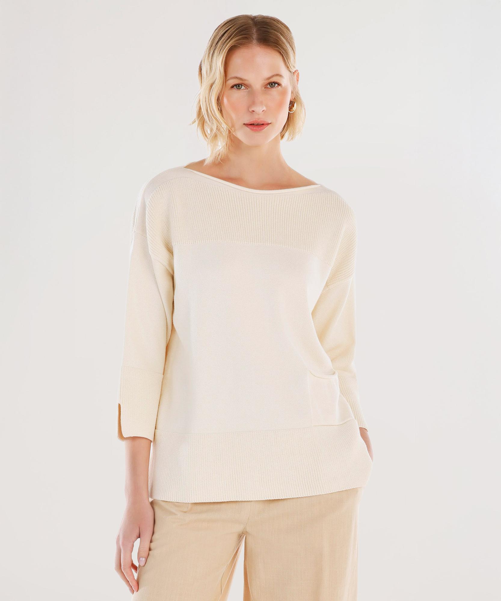 Rahat kesimi ve zarif kayık yaka tasarımıyla dikkat çeken bu 3/4 kollu triko, her mevsime uyum sağlayan şık bir seçenektir. Yumuşak dokusu sayesinde gün boyu konfor sunarken, minimal detayları modern bir hava katıyor. Jean veya kumaş pantolonlarla kolayca kombinlenerek hem günlük hem de klasik görünümler için ideal bir parçadır.