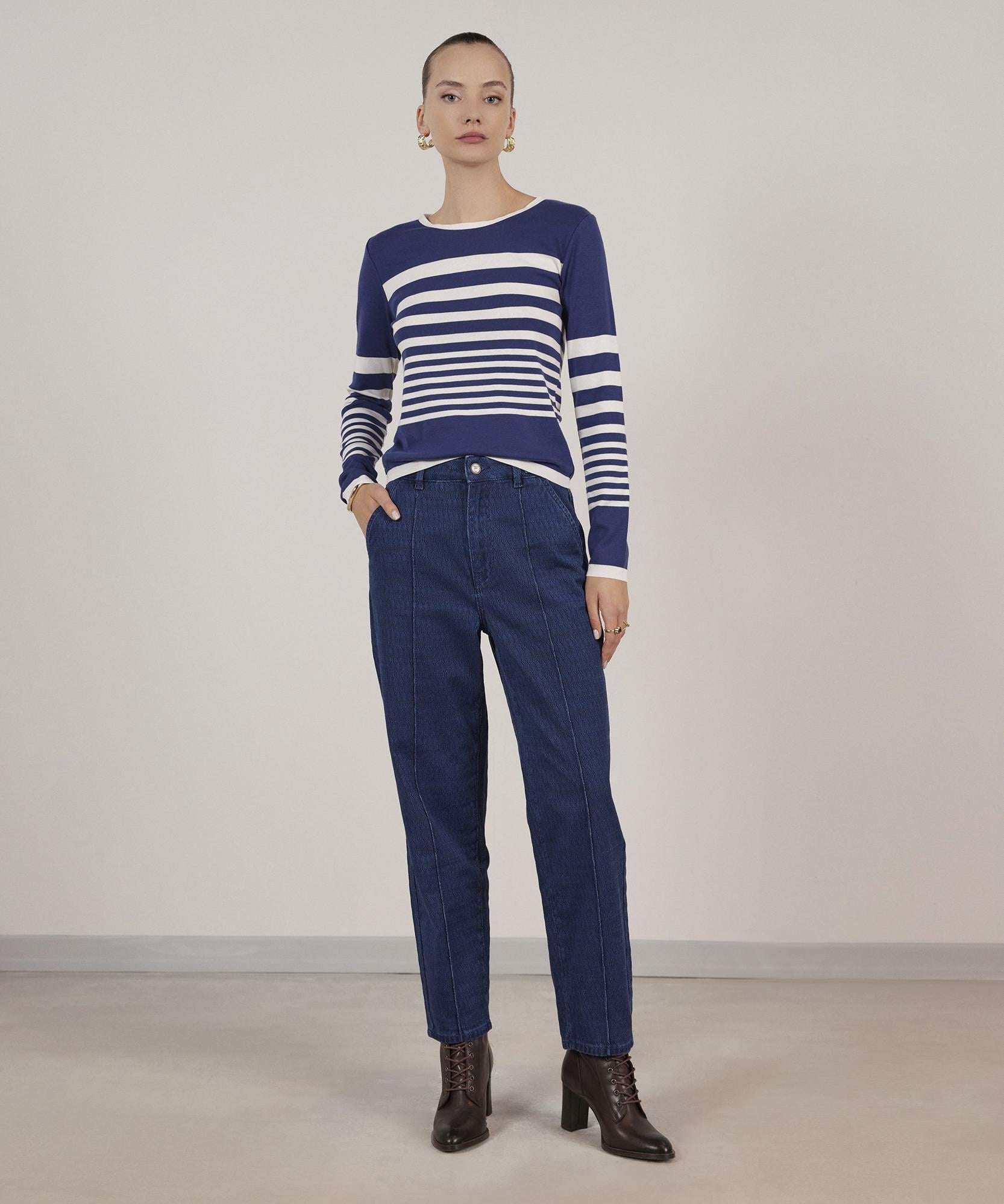 Denim pantolon pamuk kumaşı sayesinde nefes alabilir konforu ile dikkat çekiyor. Plise detaylı pantolon klasik kombinlerinize sportif vurgu katmak için ideal.