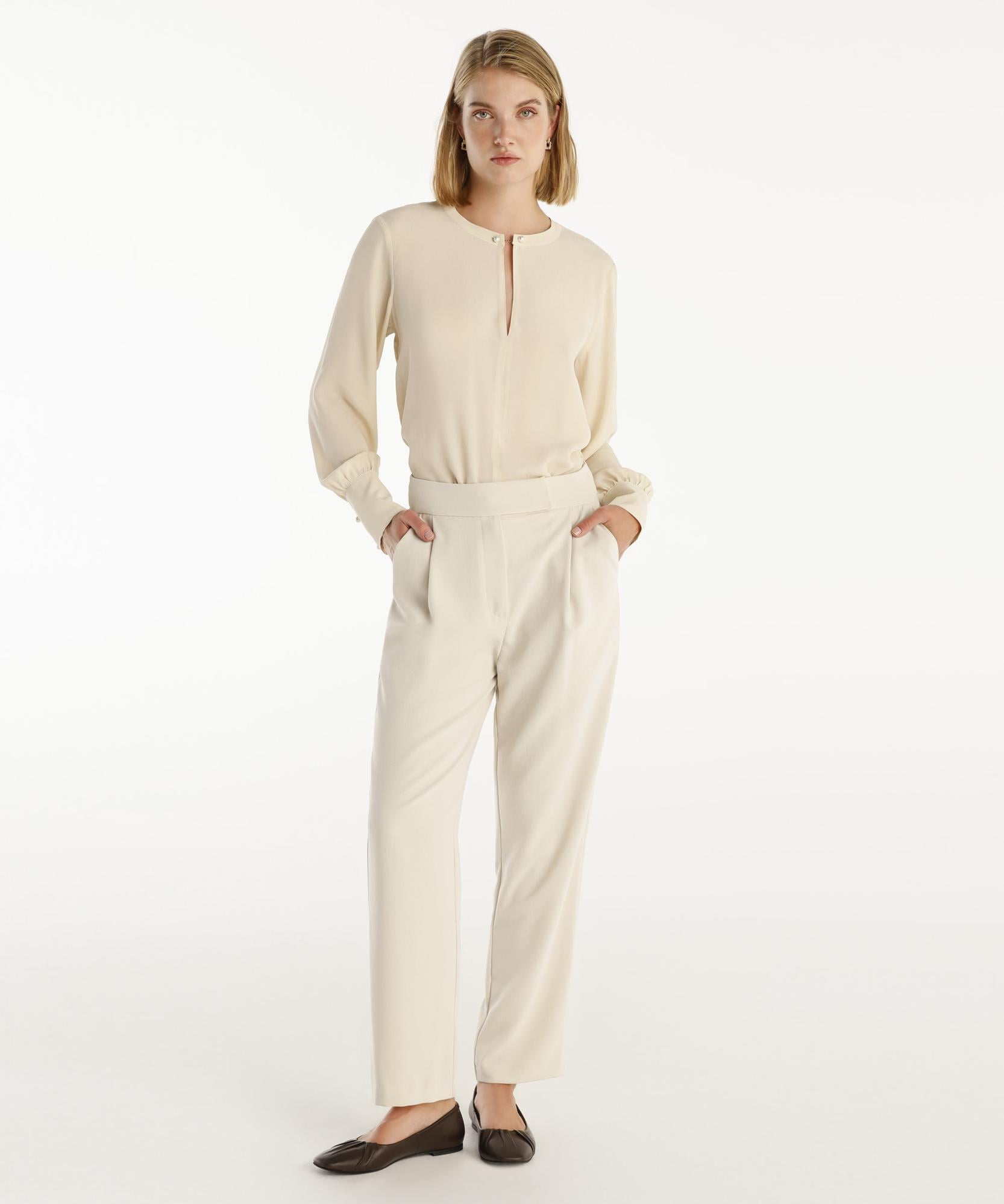 Bu zarif pantolon, klasik tarzıyla her ortama uyum sağlar. Blazer ceket ve topuklu ayakkabılarla kombinleyerek ofis stilinizi tamamlayabilir, daha rahat bir görünüm için basic bir tişört ve spor ayakkabılarla giyebilirsiniz.
