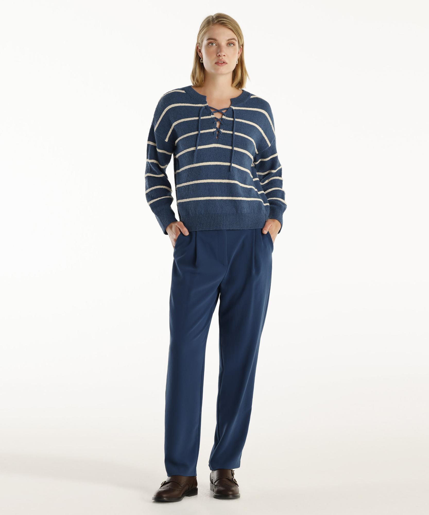 Bu zarif pantolon, klasik tarzıyla her ortama uyum sağlar. Blazer ceket ve topuklu ayakkabılarla kombinleyerek ofis stilinizi tamamlayabilir, daha rahat bir görünüm için basic bir tişört ve spor ayakkabılarla giyebilirsiniz.