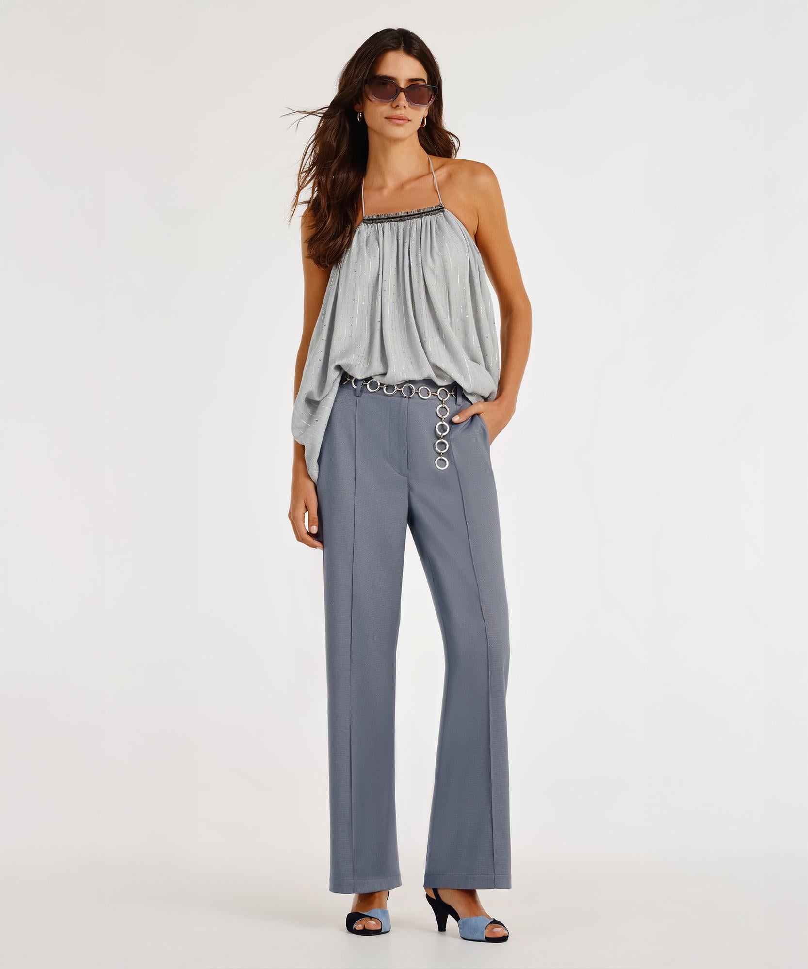 Metalik detaylı kemeri ile dikkat çeken bu pantolon, klasik kesimiyle sofistike bir stil sunar. Hafif geniş paça yapısı, zarif ve modern bir duruş sağlarken, özel günlerden günlük kullanıma kadar geniş bir kullanım alanı sunar.