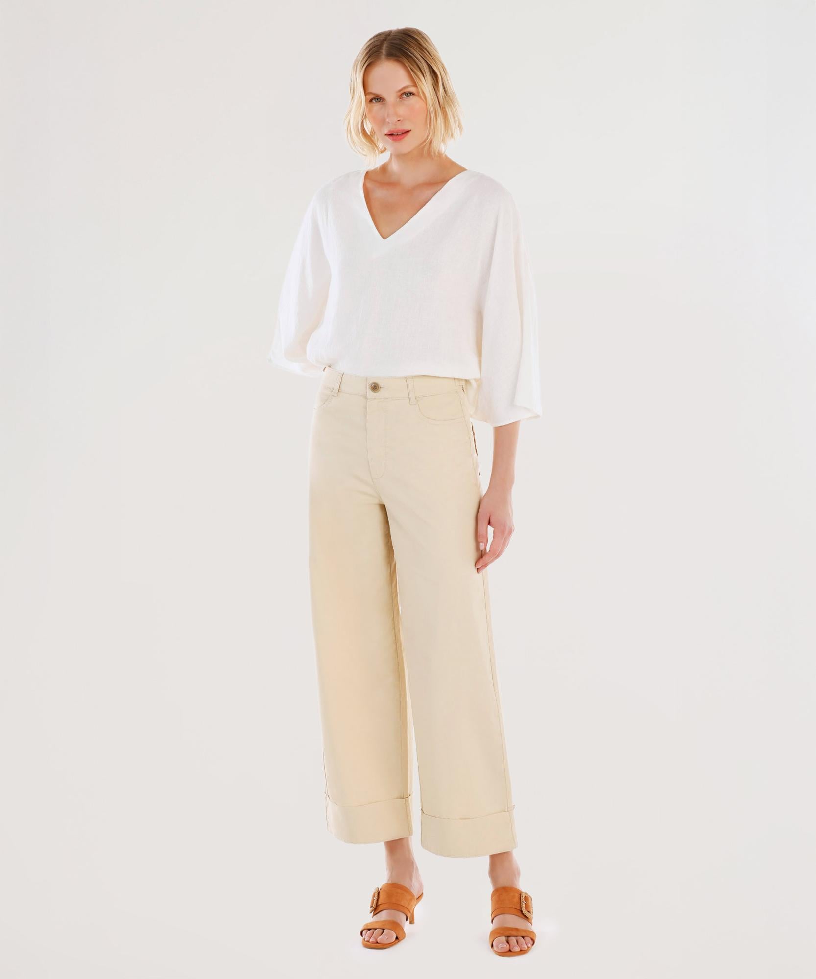 Geniş paça kesimi ve hafif kumaşıyla dikkat çeken pantolon, gün boyu konfor sağlar. Yüksek beli sayesinde şık bir duruş sunarken, modern ve minimal tasarımıyla her stile uyum sağlar. Günlük veya şık kombinlerle kolayca tamamlanarak zamansız bir parça haline gelir.