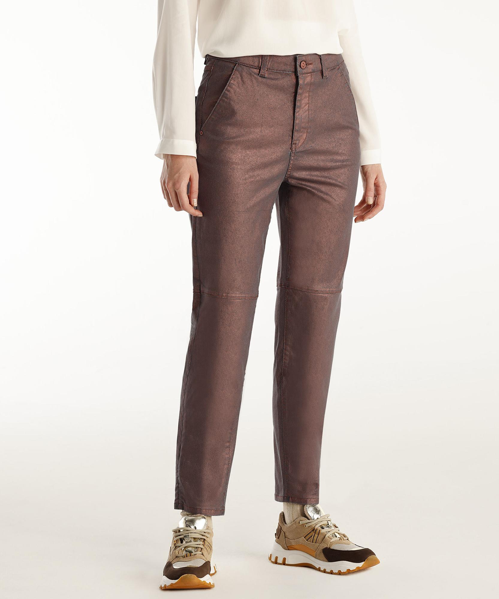Parlak dokusuyla dikkat çeken bu pantolon, cesur ve modern bir tarz sunuyor. Şık bir bluz veya sade bir üstle kombinleyerek göz alıcı bir görünüm elde edebilirsiniz. Topuklu ayakkabılarla gece şıklığı yaratırken, düz tabanlı botlarla da günlük stilinizi tamamlayabilirsiniz. Bu pantolon, iddialı ve stil sahibi bir görünüm için ideal bir seçenek.