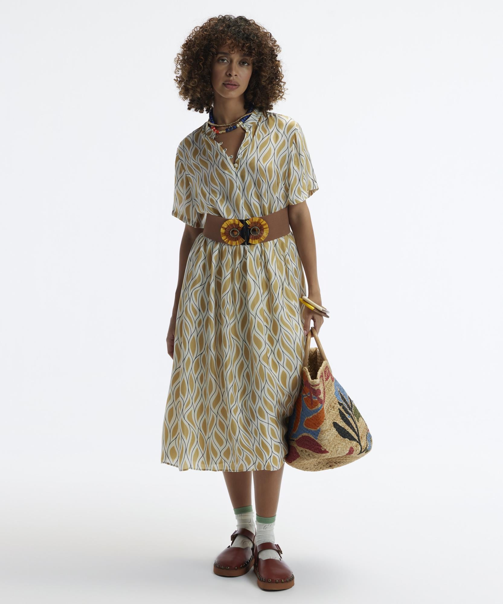 Bu canlı desenli elbise, yaz gardırobunuz için renkli ve neşeli bir katkı sağlıyor. Şehirdeki bir gün için rahat ve şık bir seçenek sunarken, plaj partileri için de uygunluk sağlar. Sade ayakkabılar ve doğal tonlardaki aksesuarlarla zamansız bir tarz yaratabilirsiniz.