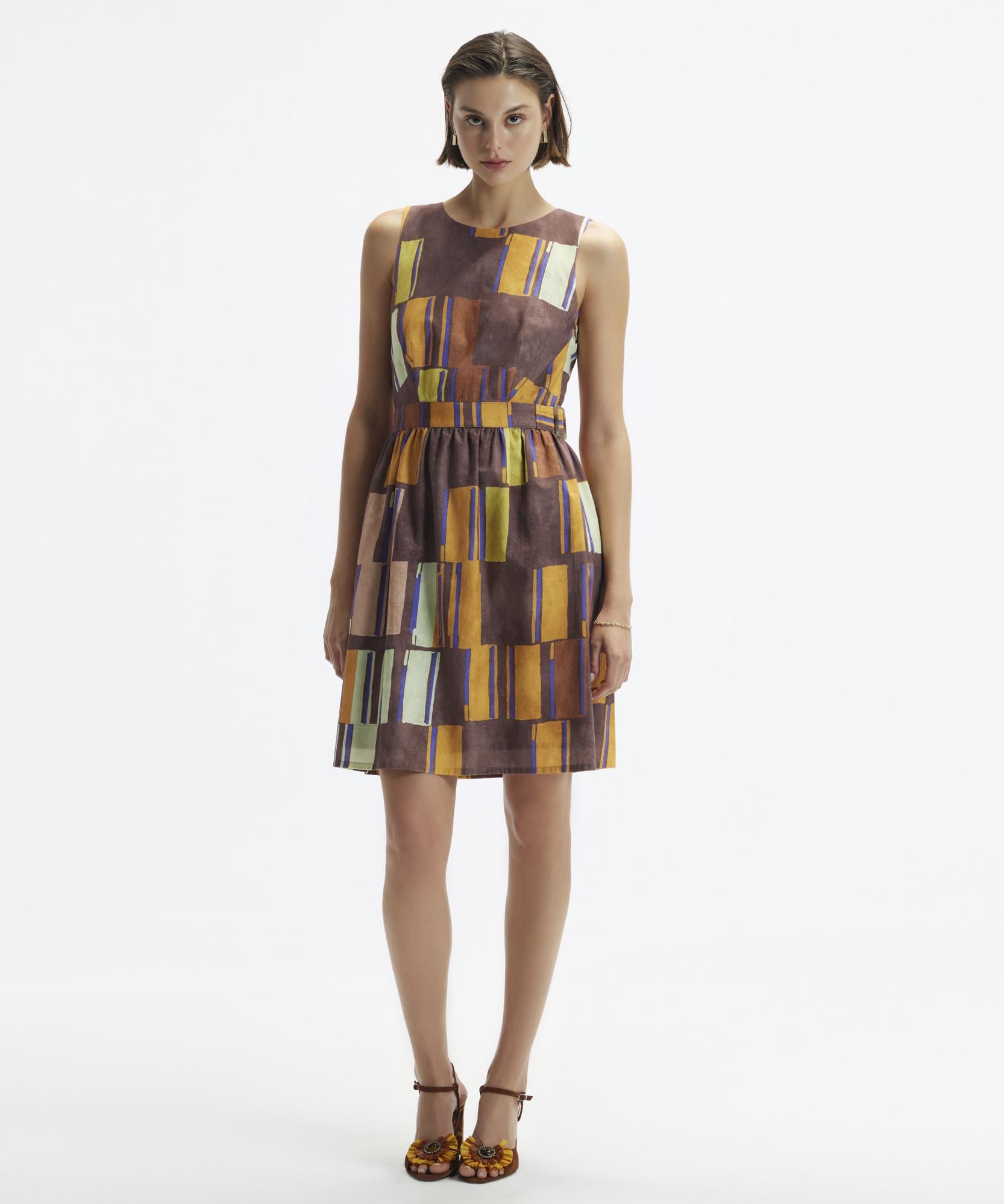 Geometrik desenleriyle modern bir hava katan bu elbise, belindeki kemer detayıyla feminen bir siluet oluşturuyor. Gündüzden geceye kolayca geçiş yapabileceğiniz bu çok yönlü parçayı, platform topuklular ve bir ceketle şehirde bir akşam yürüyüşü için tercih edebilirsiniz.