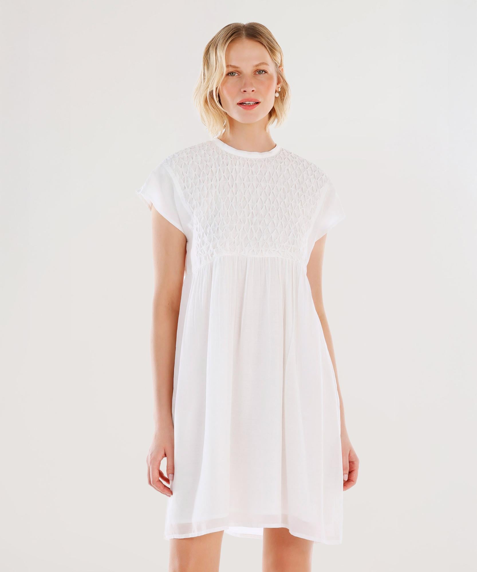 Üst kısmındaki dokulu detaylarla hareket kazanan bu elbise, zarif ve sade bir tasarıma sahiptir. Hafif ve rahat yapısı sayesinde sıcak havalarda konfor sağlar. Günlük kullanım için ideal olup, takılar ve çantalarla şıklık artırılabilir.