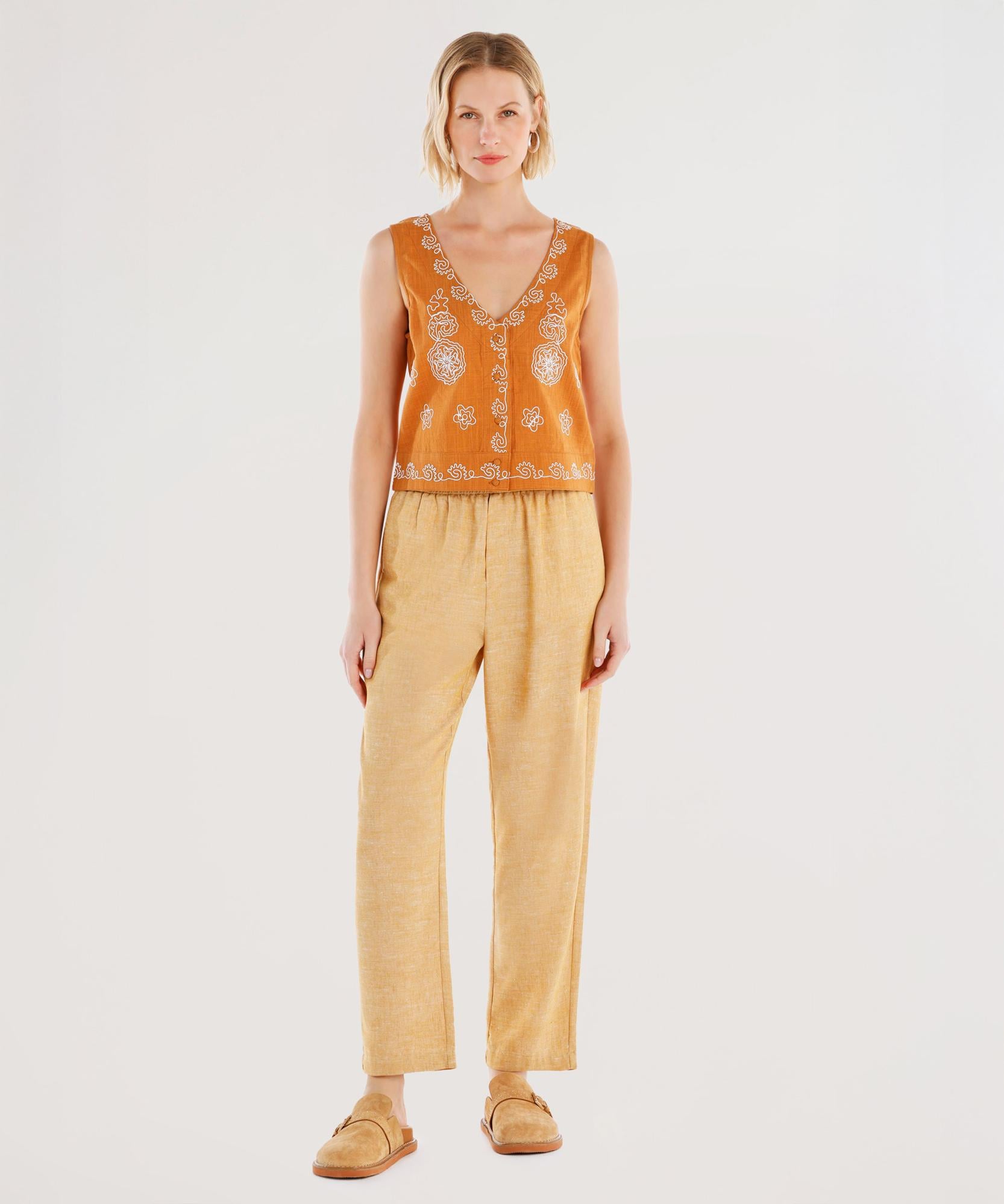 İşlemeli detaylarıyla bohem stilin vazgeçilmezi olan bu bluz, hafif dokusuyla yaz aylarında rahatlık sunuyor. Yüksek bel şort ve sandaletle kombinleyerek stilinizi tamamlayabilirsiniz.