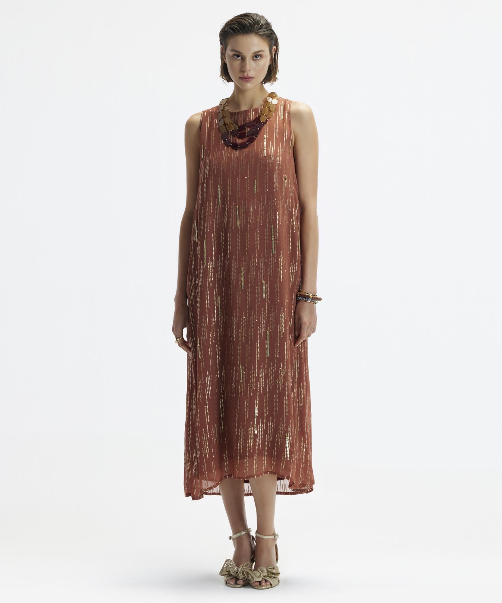 Bu elbise, metalik dokusuyla dikkat çekmeyi sevenler için kusursuz bir seçenek olmaya aday. Uzun kesimi ve düz silueti ile hem zarif hem de konforlu bir alternatif sunuyor. Sade aksesuarlar ve sivri burun topuklu ayakkabılar ile şık bir akşam yemeğine hazırsınız.