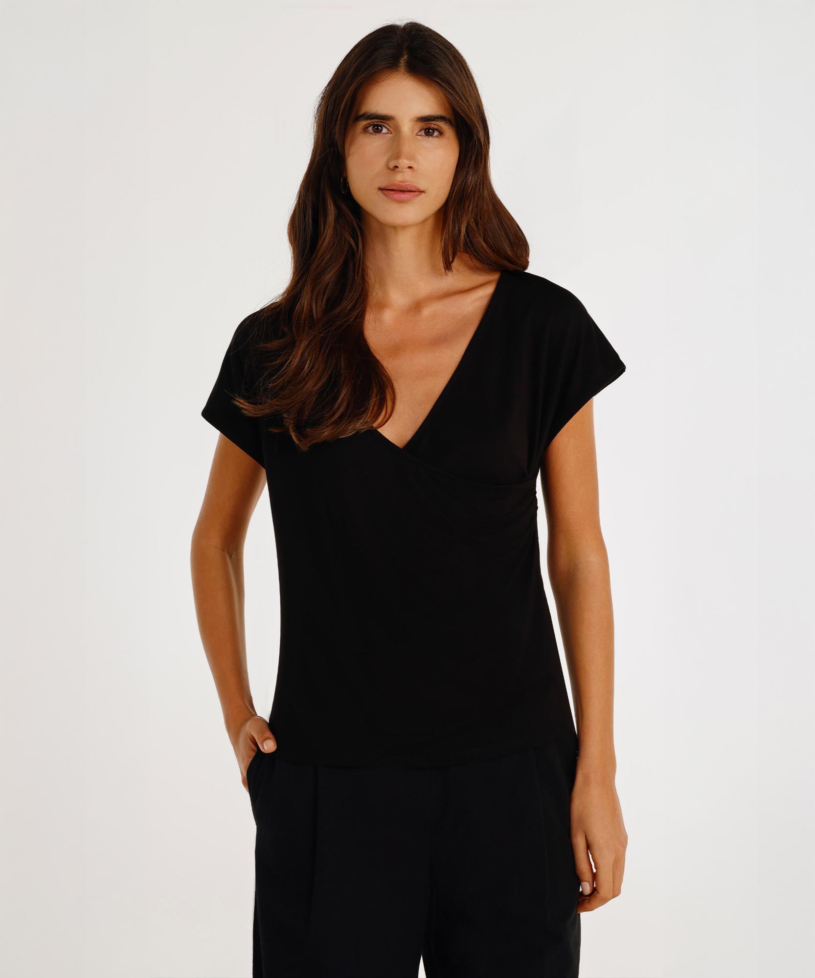 Drape detaylı bu kısa kollu t-shirt, şıklığı ve konforu bir arada sunar. Akıcı kumaşı sayesinde vücuda zarif bir şekilde oturur ve feminen bir hava katar. Günlük kullanımdan özel davetlere kadar her ortamda rahatça tercih edilebilir.