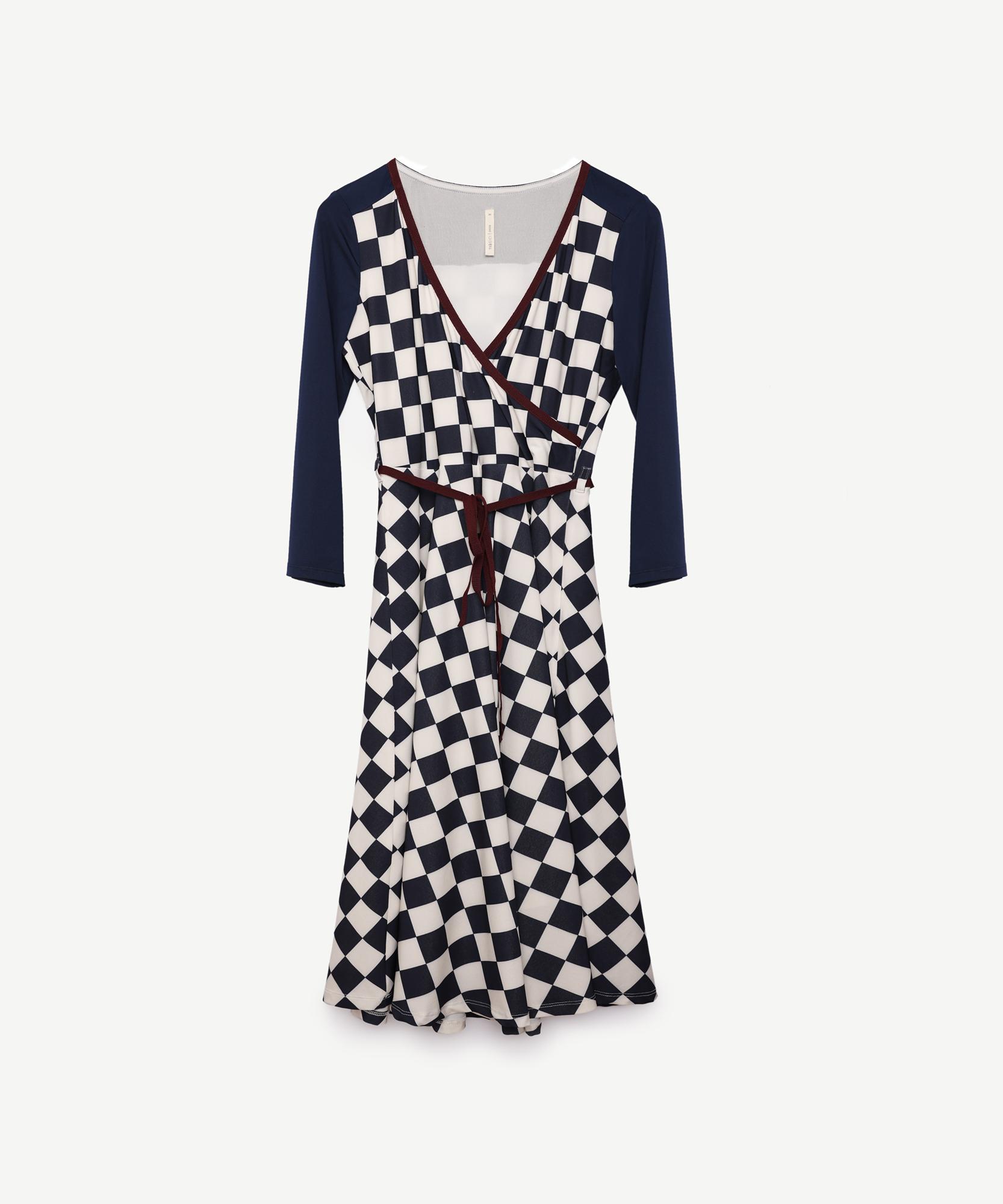 Kruvaze yakası biye detayıyla tamamlanmış kloş etekli bu elbise, dökümlü, zarifçe ışıldayan bir kumaşa sahiptir. Enerjik bir etki yaratan dama desenli bu tasarımı, botlar, sneakers ve çizmelerle tamamlayabilir, kısa hırkalarla görünümünüzde doku zenginliği yaratabilirsiniz.