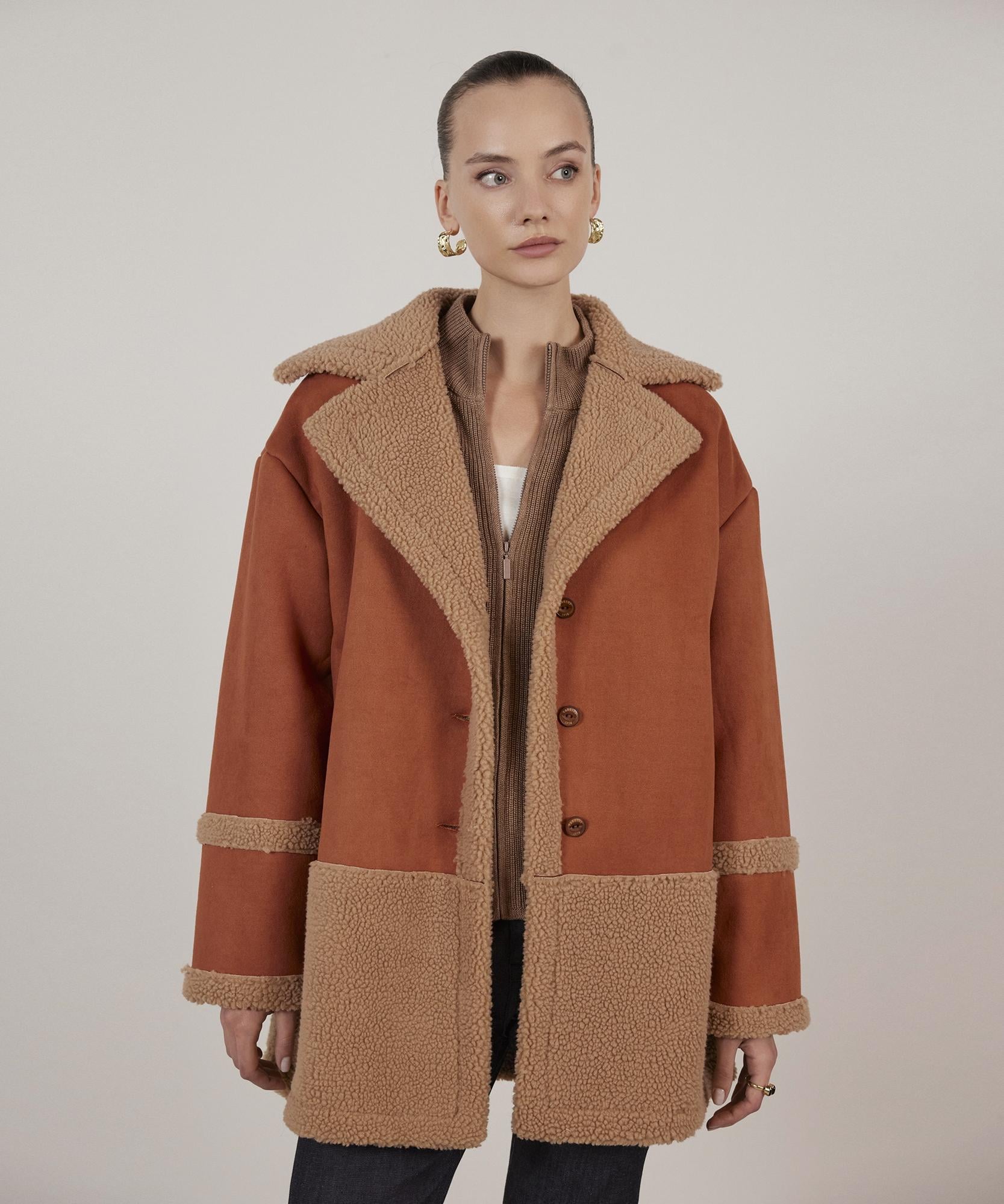 Kol, yaka ve etek kısmındaki kürk detaylarıyla hareketlendirilen mont retro tarzıyla dikkat çekiyor. Montu denim şıklığını tamamlamak için kullanabilirsiniz.