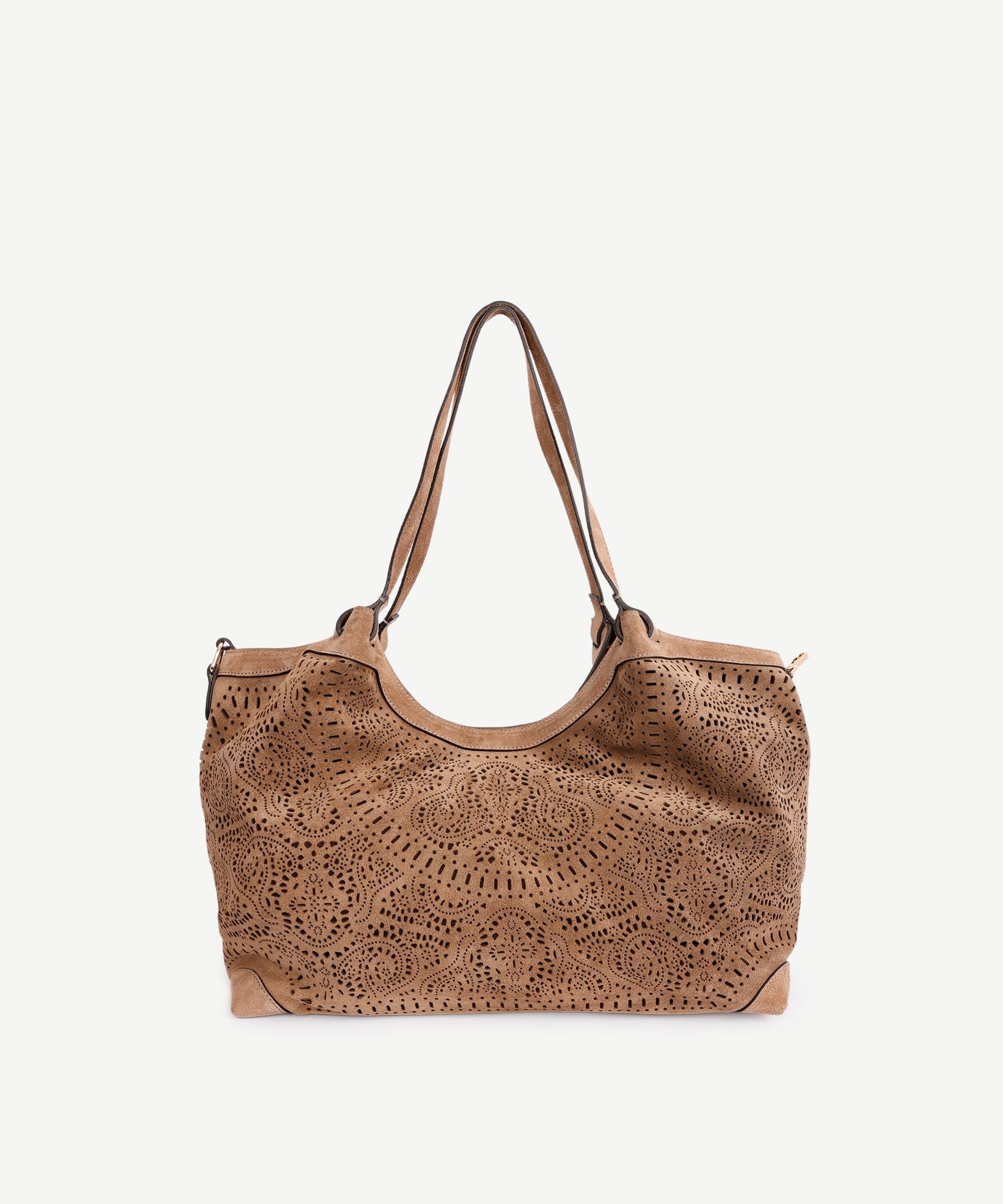 Desenli süet yüzeyiyle dikkat çeken bu çanta, feminen ve özgün bir tarz sunar. Geniş iç hacmi sayesinde günlük kullanımda konfor sağlar, çift sap detayı ise pratik bir taşıma deneyimi yaratır. Zarif lazer kesim desenleriyle sade kombinlere hareket kazandırır. Uzun yün kaban ve düz çizmelerle tamamlandığında kış aylarına şıklıkla eşlik eder.