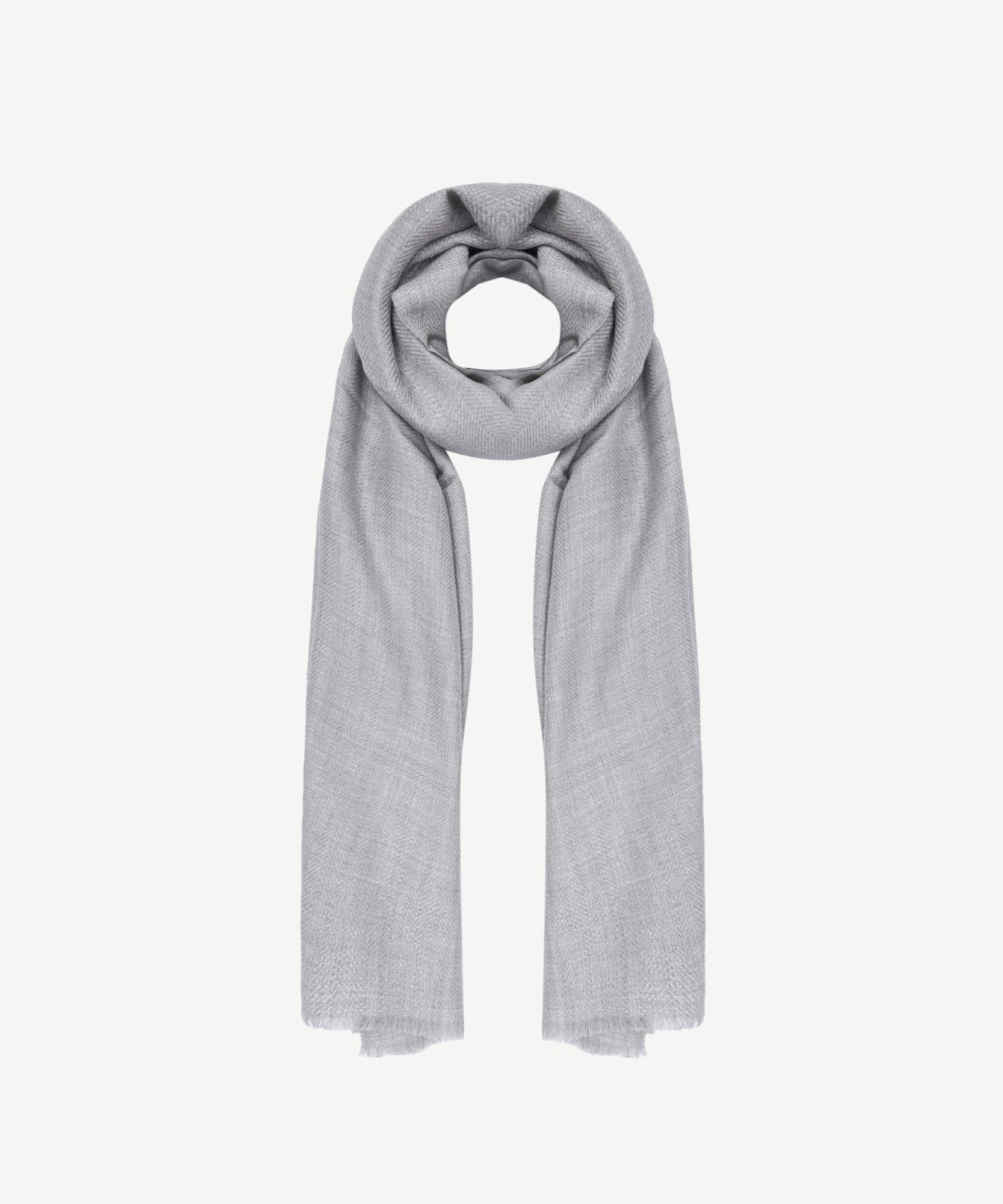 Açık gri tonlardaki bu düz şal, dokusundaki ince desen geçişleriyle yalın ama etkileyici bir duruş sunuyor. Hem klasik hem de modern stillere kolayca uyum sağlayarak günlük giyimde güçlü bir tamamlayıcı oluyor.