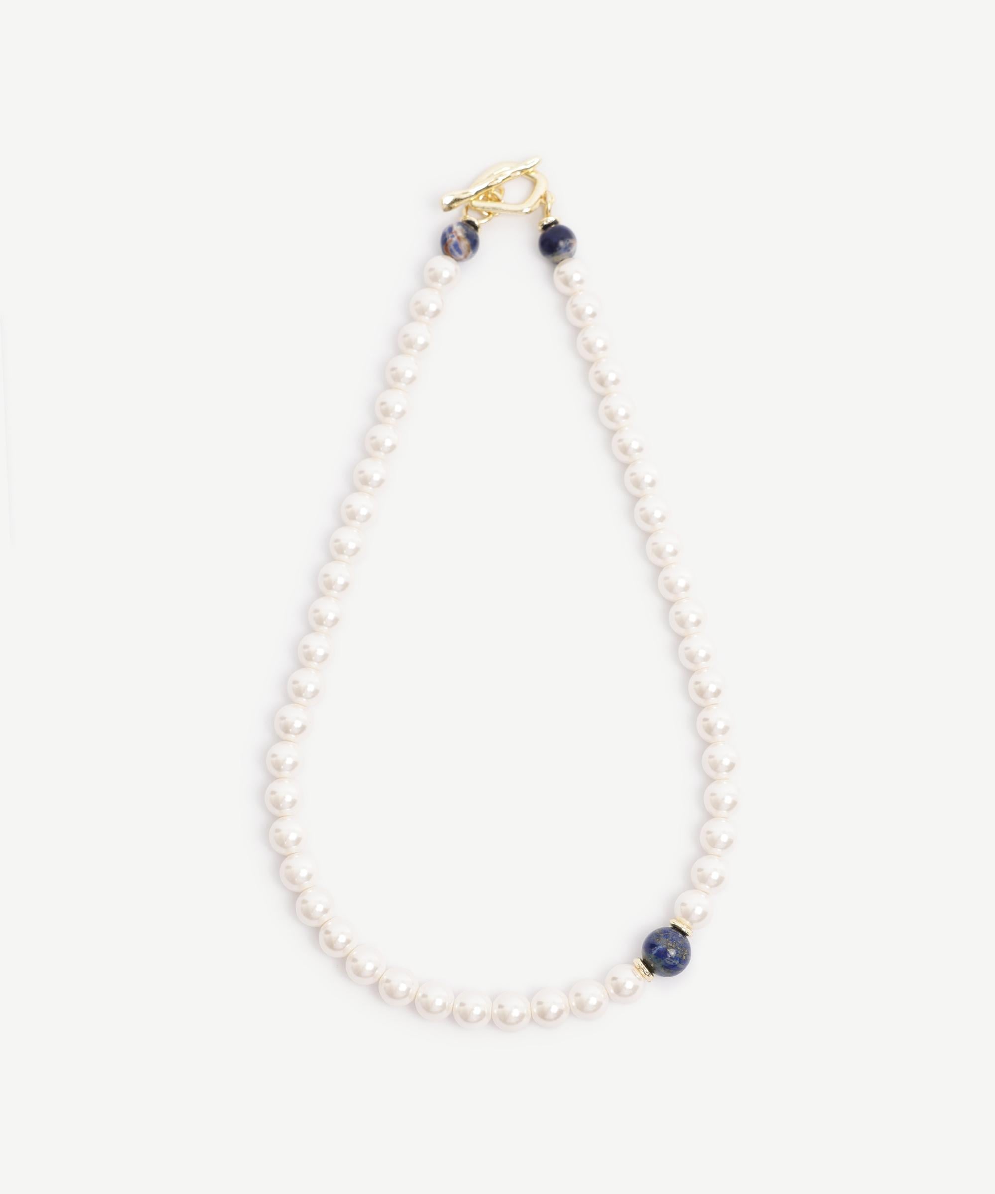 Zarif inci dizilimi ile öne çıkan bu kolye, mavi boncuk detaylarıyla klasik tasarıma modern bir dokunuş katıyor. Gold klips detayı, zarafeti tamamlayarak kullanım kolaylığı sunuyor. Şık ve zamansız duruşuyla hem özel günlerde hem günlük kombinlerde fark yaratıyor. Kış mevsiminde kaşmir kazaklar ve midi eteklerle harika bir uyum yakalıyor.