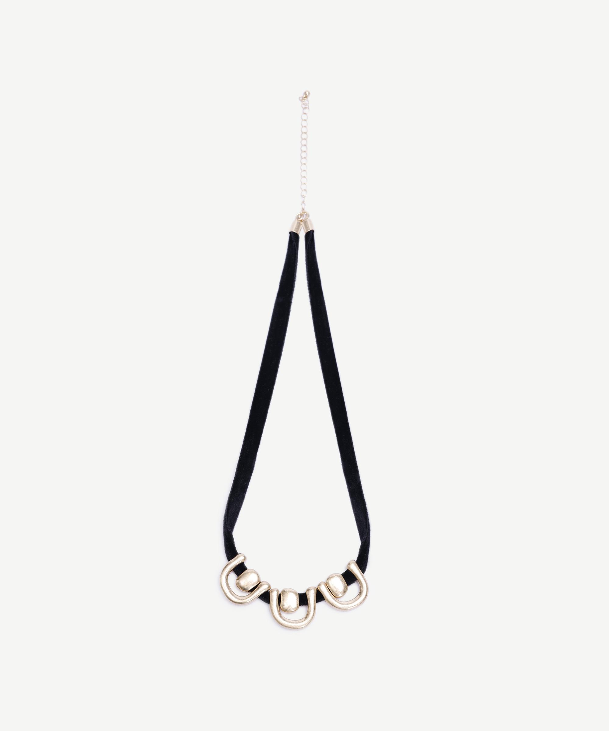 Kadife şeridi ve heykelsi detaylarıyla öne çıkan bu kolye, sonbahar kış sezonuna sofistike bir dokunuş katıyor. Boğazlı kazaklar ya da V yaka trikolarla şıklığı vurgularken, sade kombinleri bir üst seviyeye taşır. Modern ve güçlü tasarımıyla zamansız bir stil sunar.