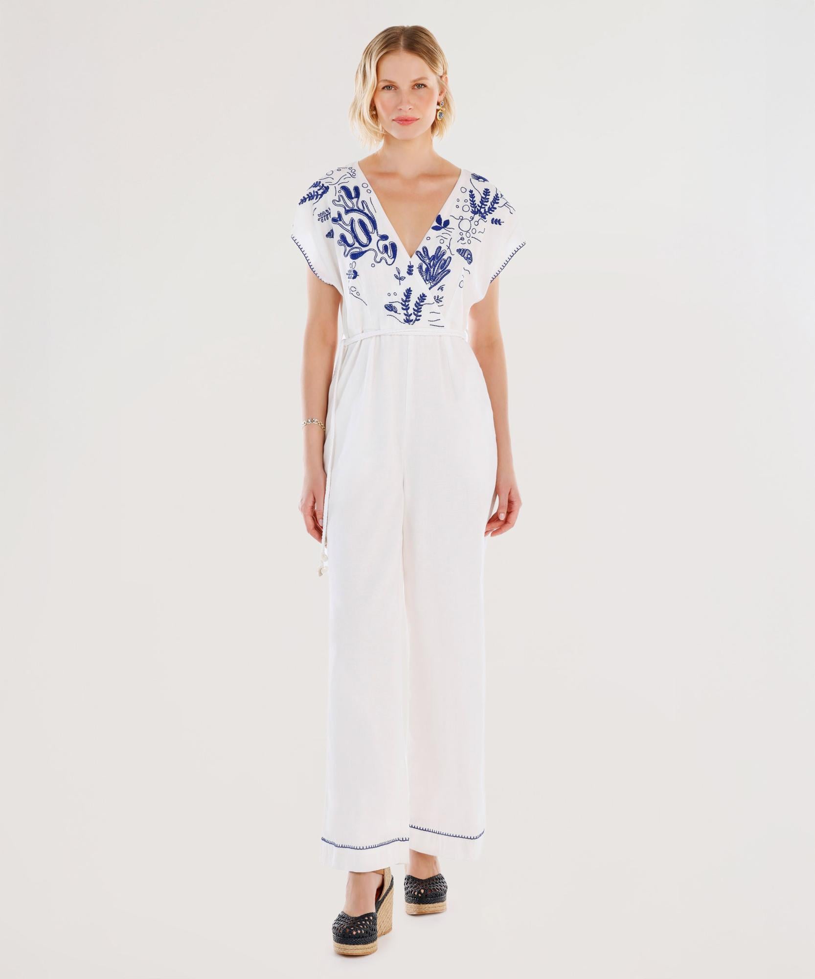 Etnik işlemeleriyle dikkat çeken bu uzun tulum, özgün ve zarif bir stil sunuyor. V yakalı tasarımı feminen bir hava katarken, hafif dokusu gün boyu rahat bir kullanım sağlıyor. Hem plaj stilinde hem de günlük şıklıkta rahatlıkla tercih edilebilir.
