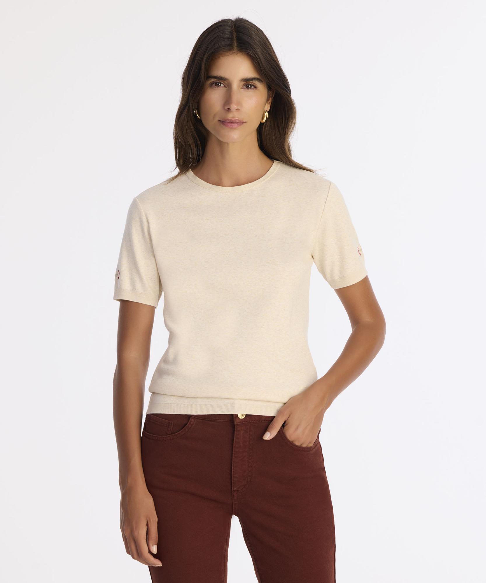 Kol detaylarında yer alan minik nakış işlemeleriyle fark yaratan bu kısa kollu triko, sade tasarımına zarif bir dokunuş katıyor. Yumuşak dokusu sayesinde ciltle uyumlu bir hissiyat sunarken, hem tek başına hem de hırka altına rahatlıkla kullanılabiliyor. Kış aylarında oversize trikolarla veya kaşe ceketlerle katmanlı kombinler oluşturarak stilinize sıcak bir şıklık katabilirsiniz. Günlük kullanıma uygun yapısıyla gardırobunuzun vazgeçilmez parçası olacak.