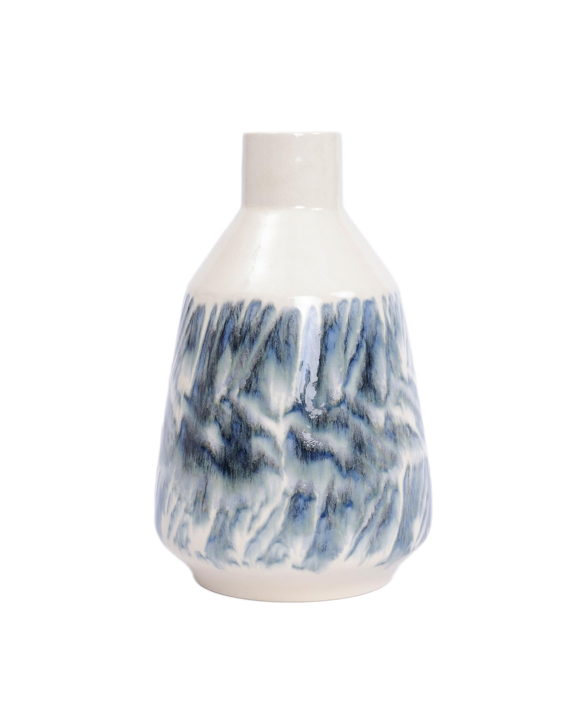 Doğadan ilham alan desenleriyle dikkat çeken bu seramik vazo, yüzeyindeki akışkan efektlerle adeta sanat eseri hissi uyandırıyor. Mat ve parlak yüzeyin birleşimiyle modern ve özgün bir görünüm sunuyor. Tekli kuru dal ya da ince yapay çiçeklerle sergilenerek etkileyici bir dekor haline geliyor. Salon, yemek odası ya da kitaplık gibi alanlarda göz alıcı bir detay olarak kullanılabilir.