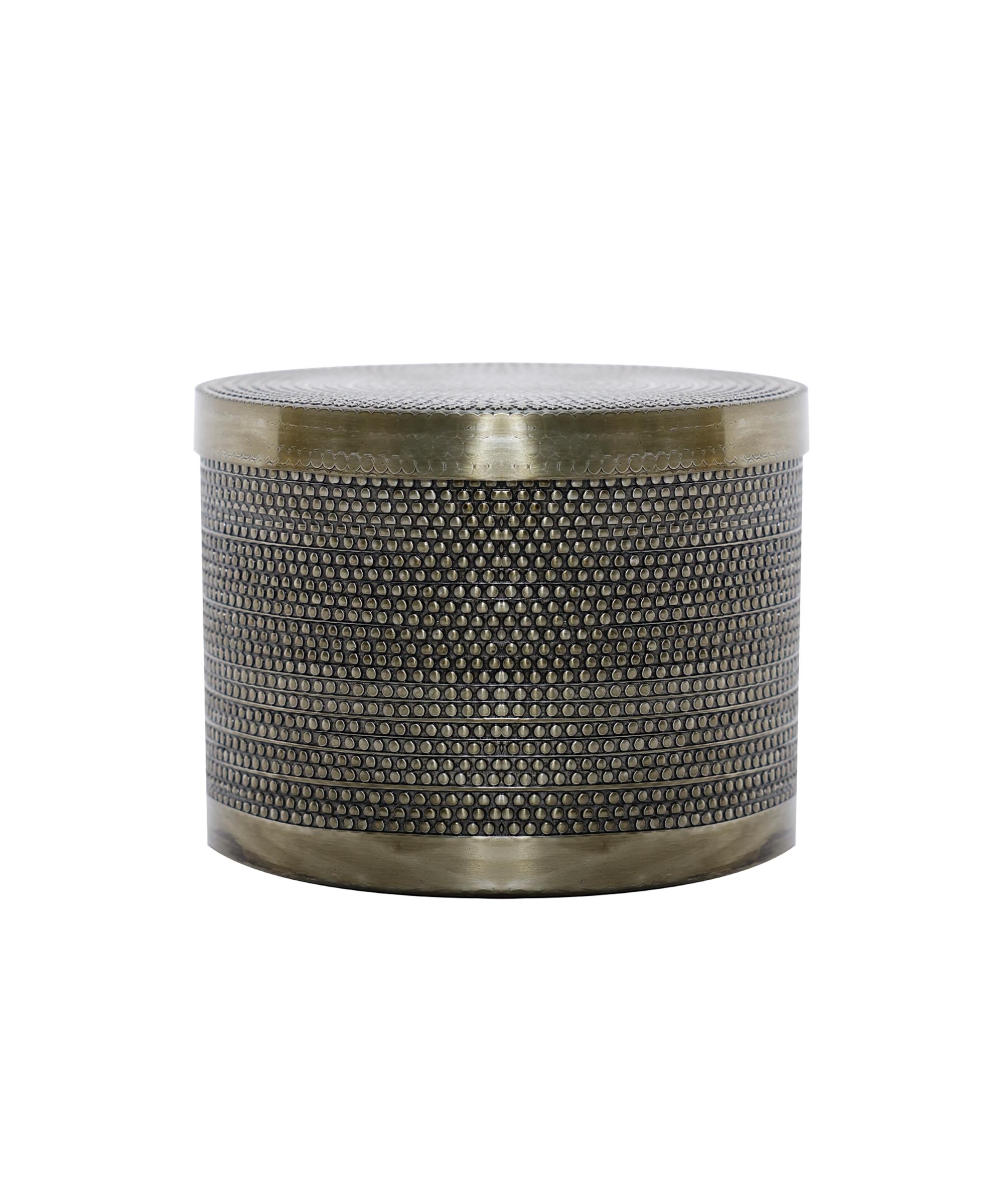 Metal dokusuyla öne çıkan bu silindirik kutu, hem fonksiyonel hem de dekoratif bir obje olarak yaşam alanlarında yerini alıyor. Kapağı sayesinde küçük eşyaları düzenli bir şekilde saklamaya imkân tanırken, koyu pirinç tonlarıyla kış sezonuna uygun güçlü bir karakter sunuyor.