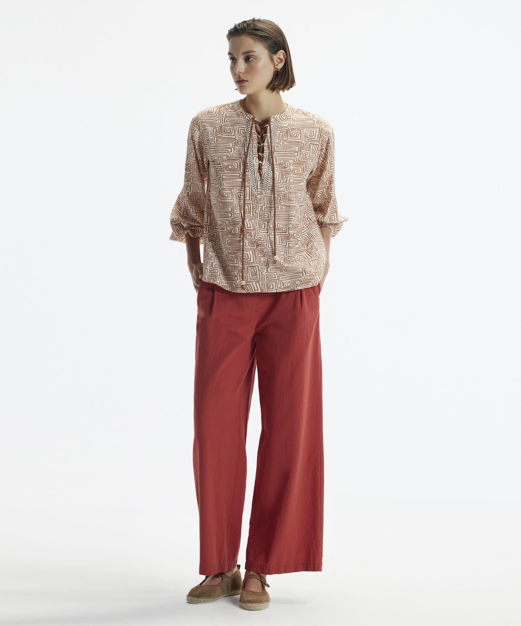 Bohem ve özgür ruhlu tarzınızı yansıtacak bu gömlek, ilgi çekici tasarımıyla dikkatleri üzerine çekiyor. Bağcıklı yaka detayı ile farklı bir stil sunarken, geniş kesimi ile gün boyu rahat etmenizi sağlar. Bu gömleği, düz kesim pantolon ve bohem bir çanta ile kombinleyerek özgün bir tarz yaratabilirsiniz.