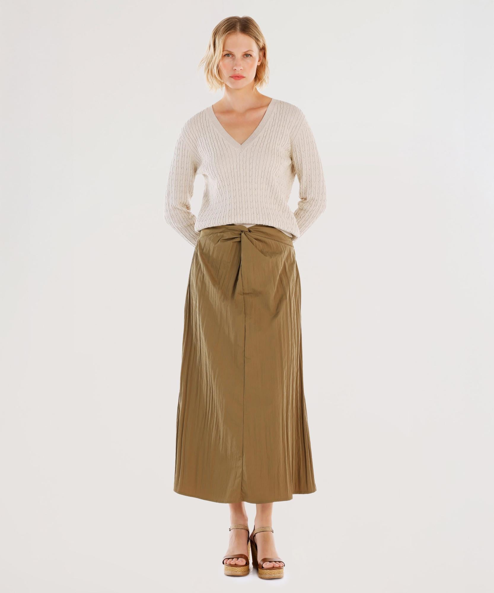 Ön düğme detaylarıyla hareket kazanan bu midi etek, günlük ve şık kombinler için mükemmel bir seçimdir. Bluz veya tişörtlerle tamamlanabilir, sandalet veya topuklu ayakkabılarla zarif bir görünüm elde edilebilir. Kumaşın hafif dokusu sıcak havalarda rahatlık sunarken, düğme detayları eteğe klasik bir hava katmaktadır.