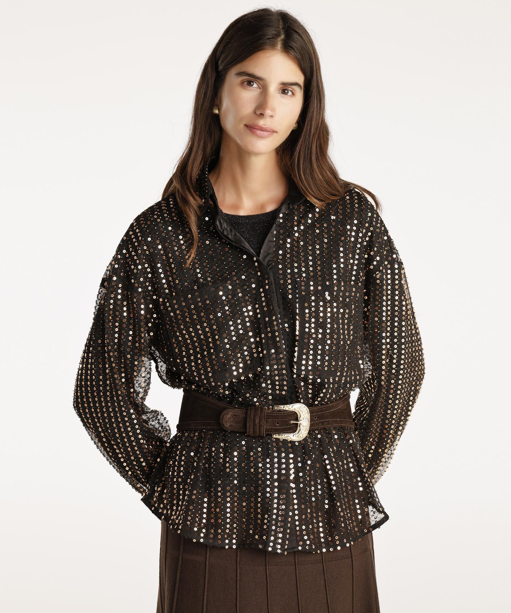 Sim işlemeli bu transparan gömlek, cesur ve dikkat çekici bir gece stili için mükemmel bir seçenek. Altına yüksek bel pantolon ve stiletto ile kombinleyebilirsiniz, şık ve iddialı bir görünüm yaratır. Minimal aksesuarlarla stilinizi tamamlayabilirsiniz.