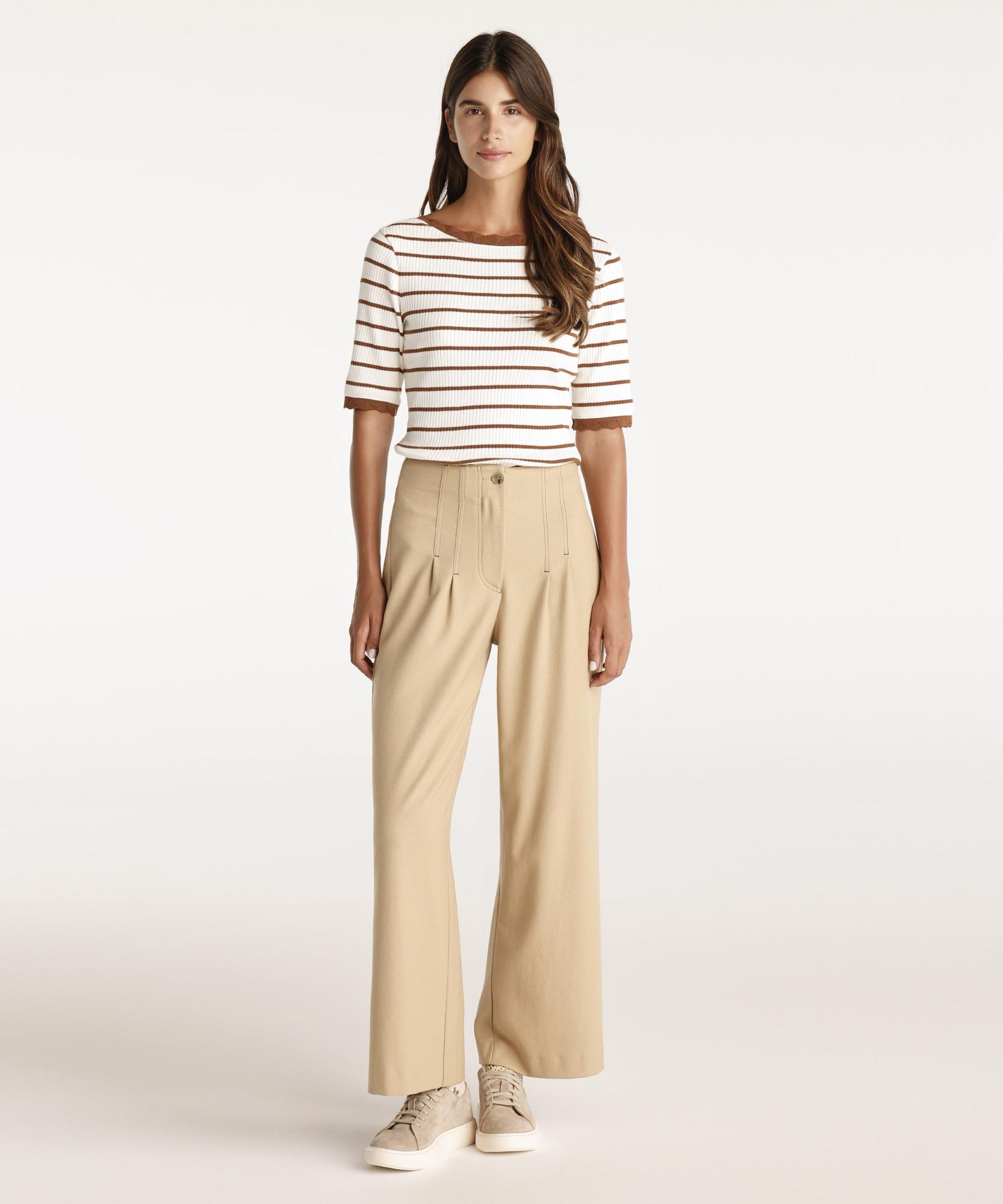 Bu yüksek bel, bol paçalı pantolon, rahatlık ve şıklığı bir araya getiriyor. Günlük kombinlerde klasik bir gömlek veya bluzla tamamlanabilir, topuklu ayakkabılarla zarif bir görünüm elde edilebilir. Ofis ortamında veya günlük şıklıkta rahatça tercih edilebilir.