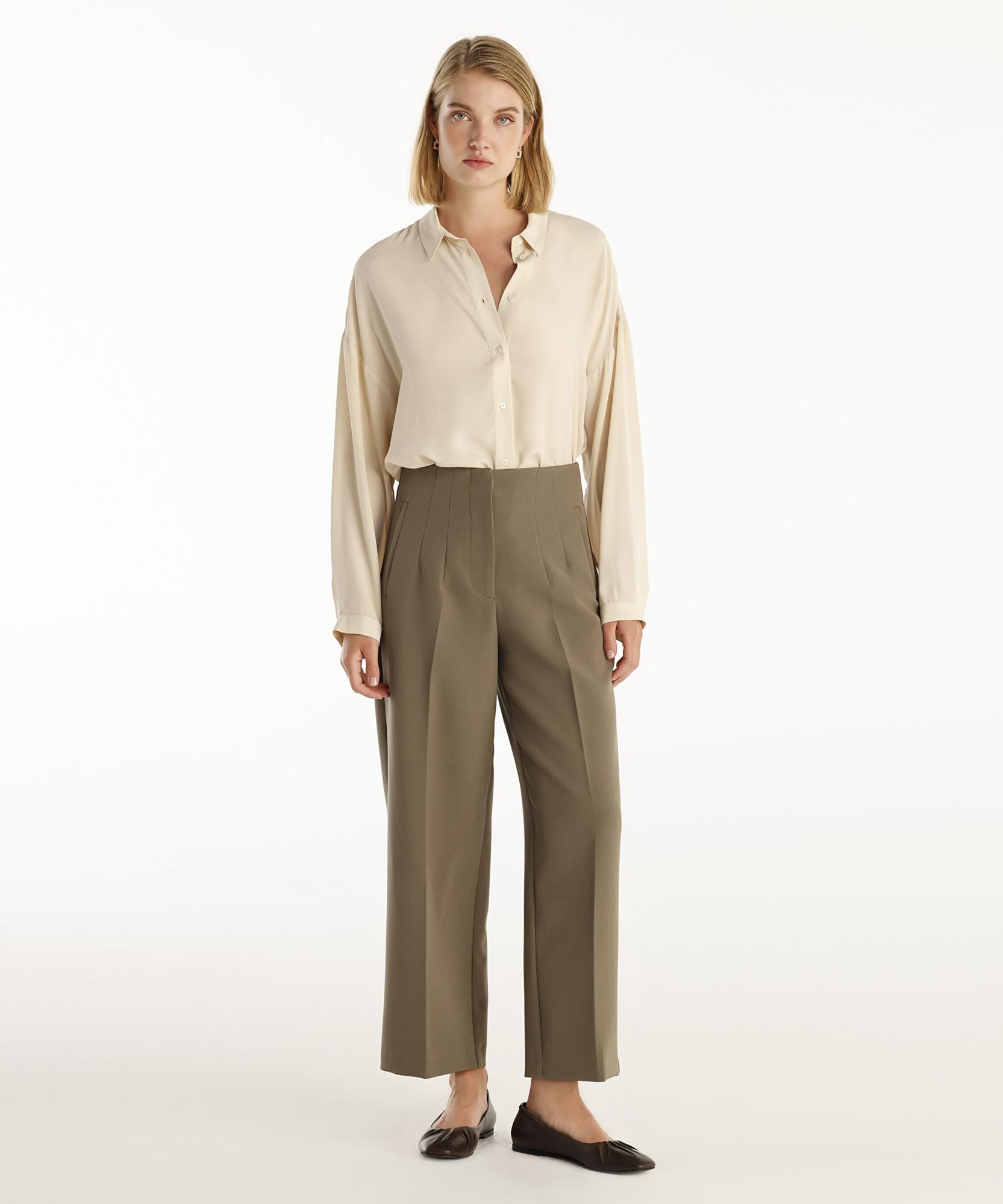 Bu yüksek bel, bol kesim pantolon, rahatlık ve şıklığı bir arada sunar. Hafif dökümlü yapısı sayesinde gün boyu konfor sağlar ve stil sahibi bir görünüm oluşturur. Kısa bluzlar veya gömleklerle kombinlenerek modern ve zarif bir görünüm elde edilebilir.