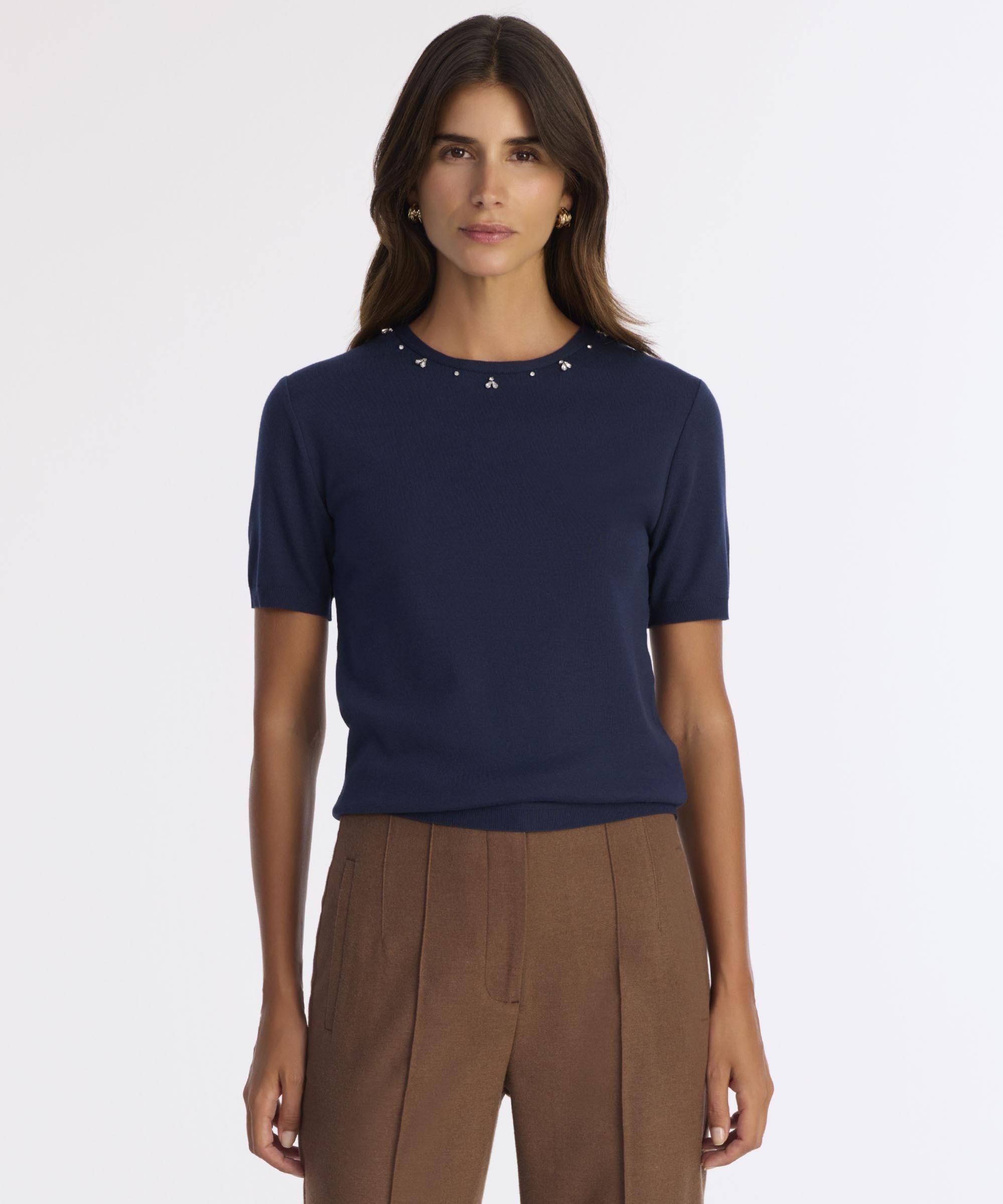 Yakası inci ve taş detaylarıyla süslenmiş bu kısa kollu triko, zarif ve sade duruşuyla öne çıkıyor. İnce yapısı sayesinde mevsim geçişlerinde ya da kış aylarında hırka ve ceketlerle rahatça kombinlenebiliyor. Özellikle yüksek bel kumaş pantolonlar veya kalem eteklerle birlikte kullanıldığında şık bir görünüm sağlıyor. Hem ofis stilinize hem de günlük şıklığınıza zarif bir dokunuş katmak isterseniz tercih edebilirsiniz.