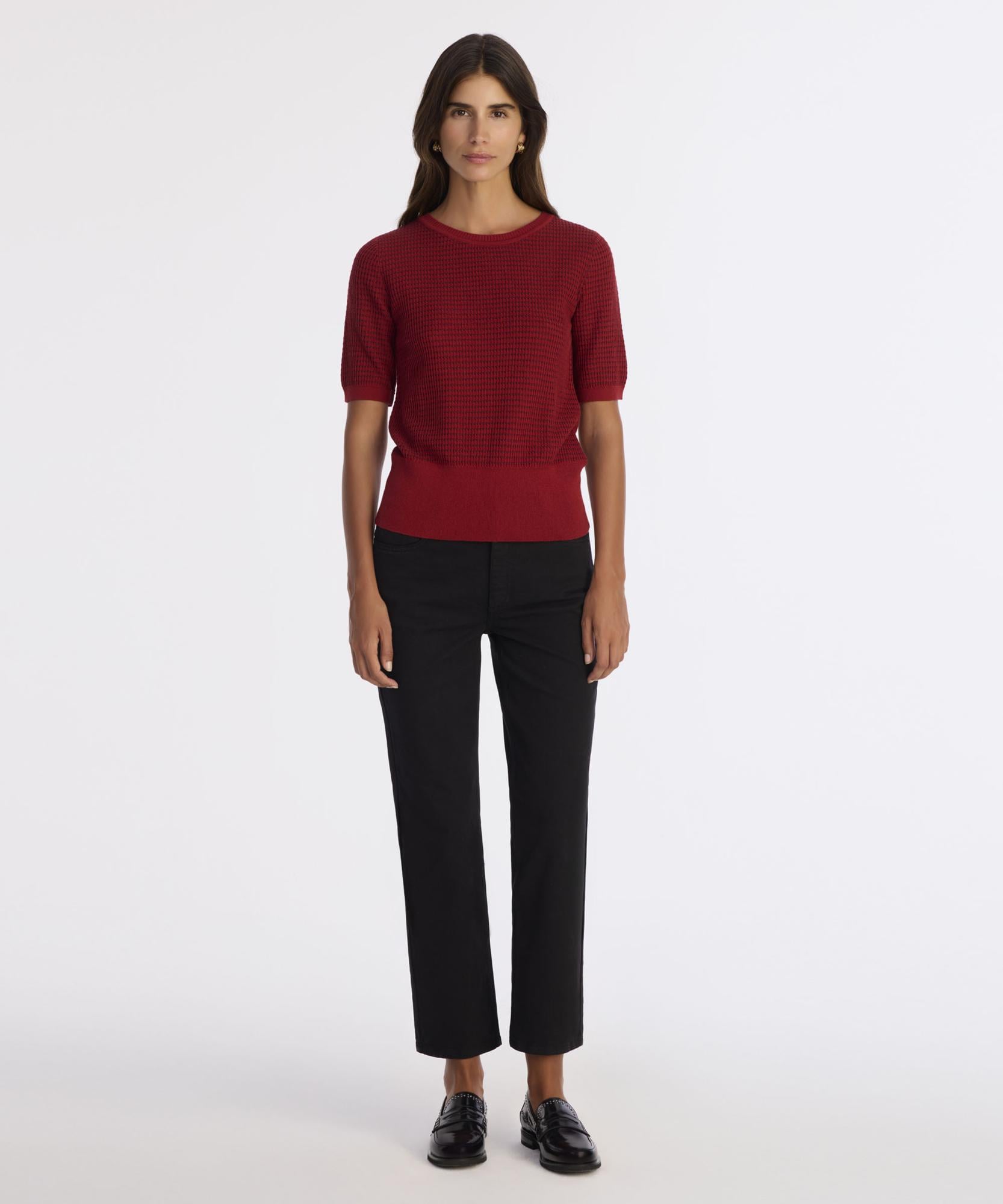 Yatay mini desenleri ve kısa kol yapısıyla öne çıkan bu triko, sade çizgilerle modern bir görünüm sunuyor. Yumuşak dokusu sayesinde cilt dostu bir konfor sağlarken, klasik ve rahat kesimiyle günlük kullanım için idealdir. Kış aylarında oversize hırkalar veya kalın örgü yeleklerle katmanlı şekilde kombinlenerek stilinizi tamamlayabilirsiniz. Geniş paça pantolonlarla birlikte hem şık hem konforlu bir bütünlük oluşturur.